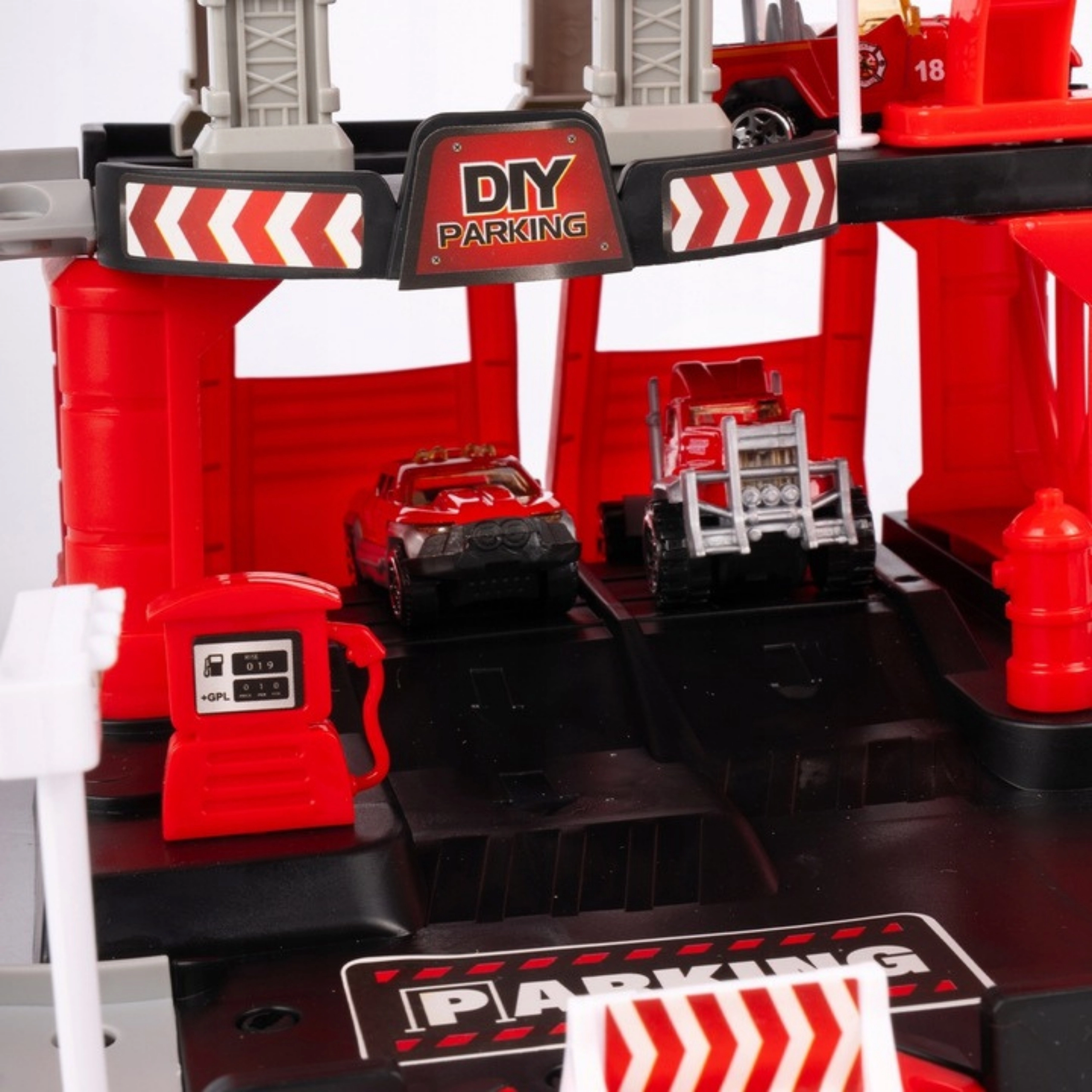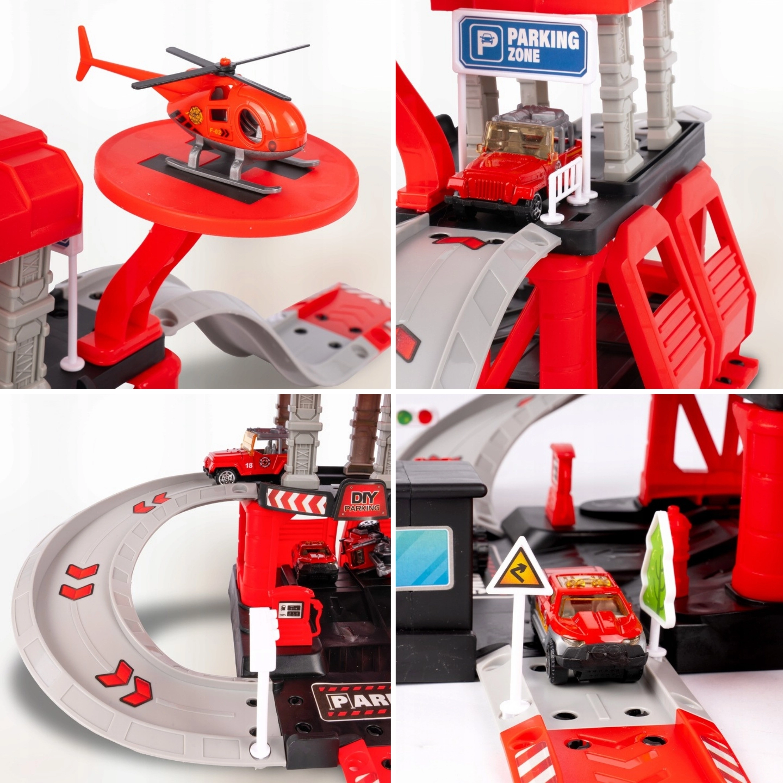 Otkrijte svijet akcije sa setom Woopie koji kombinira realistične detalje i izdržljivu konstrukciju sigurnu za djecu od 3 godine. Dvoetažno parkiralište sa spustovima, dizalom i sletnom površinom za helikopter donosi beskrajne mogućnosti igre – od intervencija na požarima do upravljanja prometom.