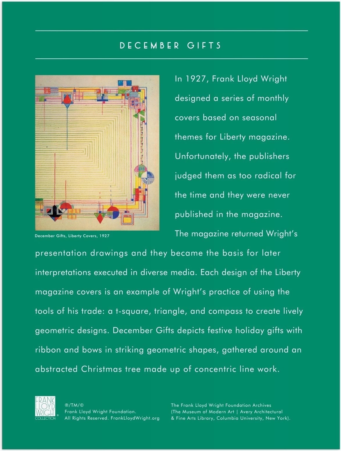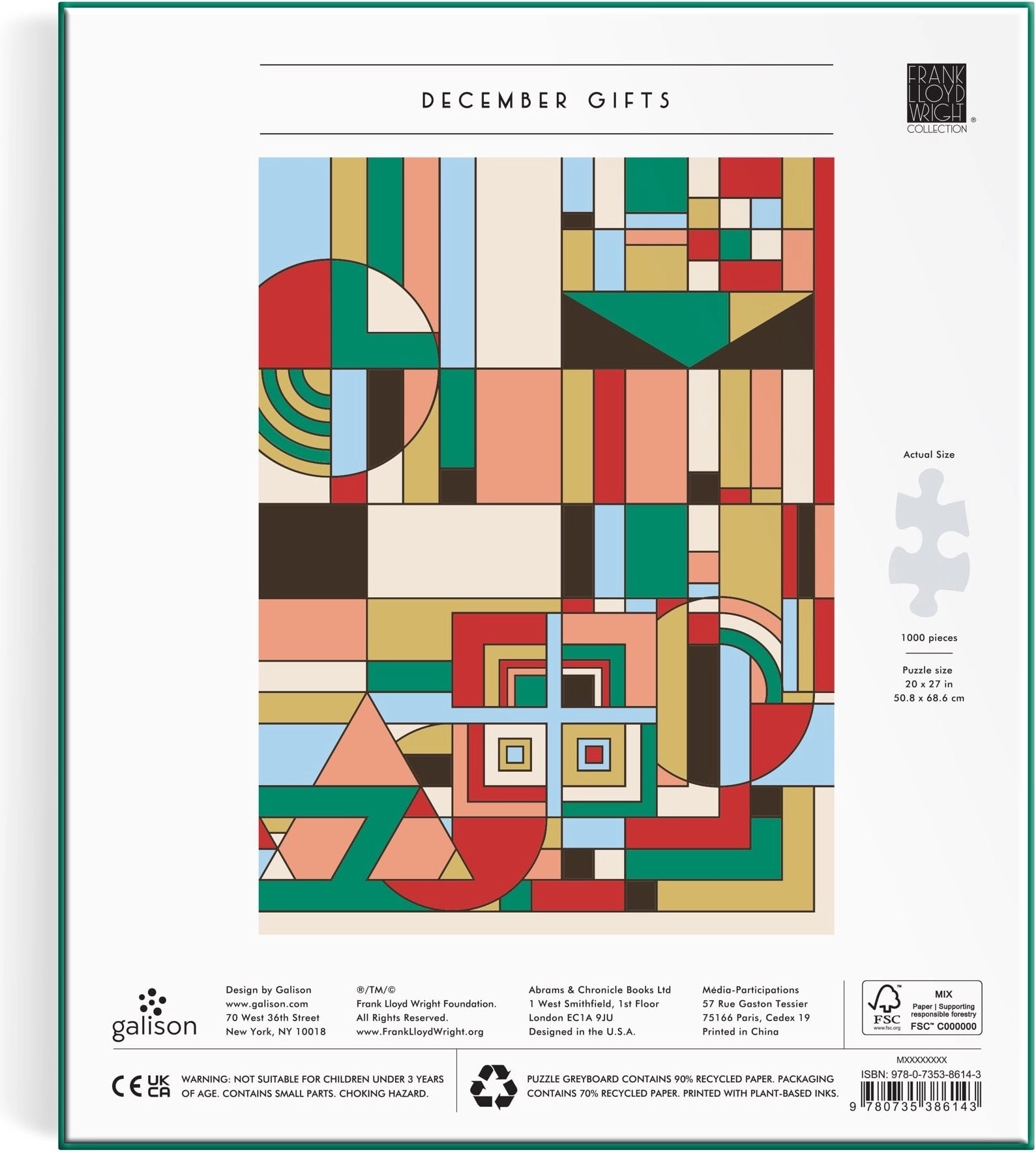 Metalna puzzle Galison s motivom FRANK LLOYD WRIGHT – Prosinački darovi donosi premium doživljaj slaganja. Posebna metalna površina reflektira svjetlo iz različitih kuteva, pa odabrani dijelovi izgledaju kao od zlata i srebra. Rezultat je dojmljiva slika koja će se istaknuti u svakom interijeru.