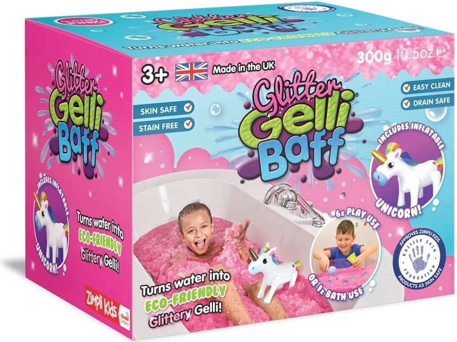 Glitter Gelli Baff donosi djeci senzornu zabavu u kadi i izvan nje. Za nekoliko minuta voda se pretvara u gustu, ružičastu i blistavu želatinu koja je netoksična, bez štetnih kemikalija i dermatološki nježna. Po završetku igre dodajte priloženo sredstvo za otapanje i gel će se pretvoriti natrag u vodu koju je moguće sigurno ispustiti.