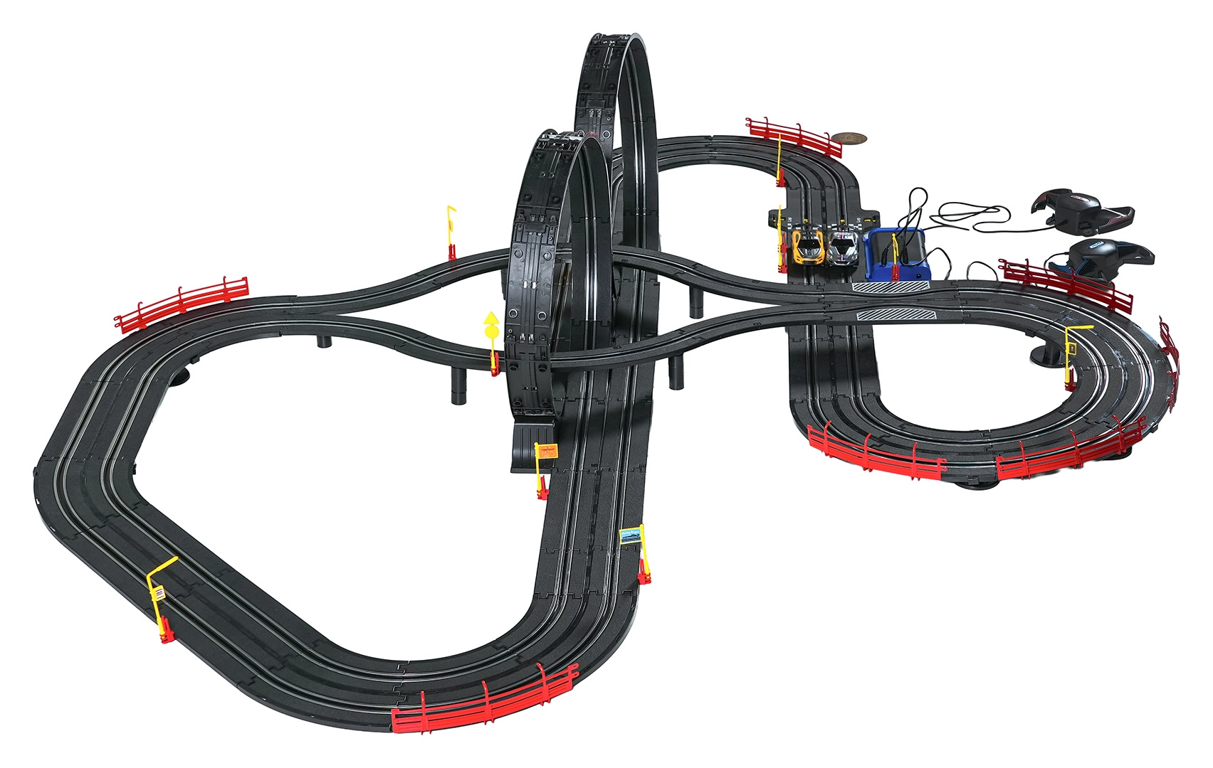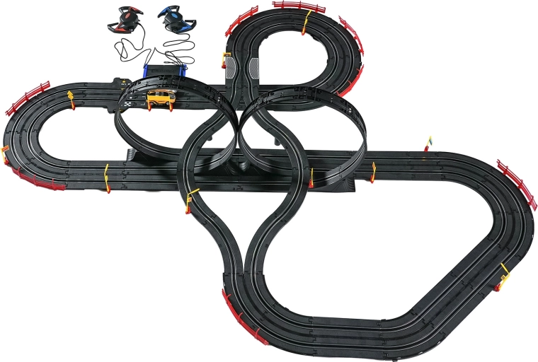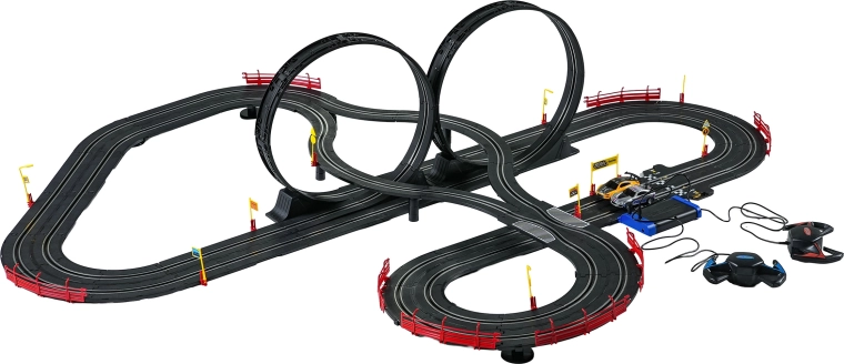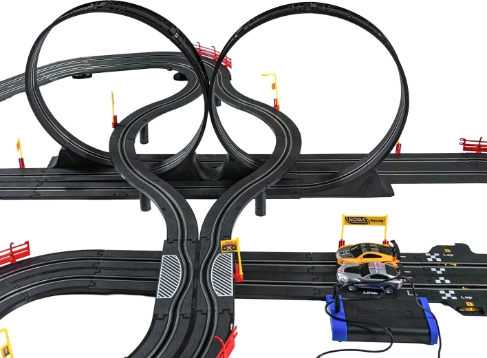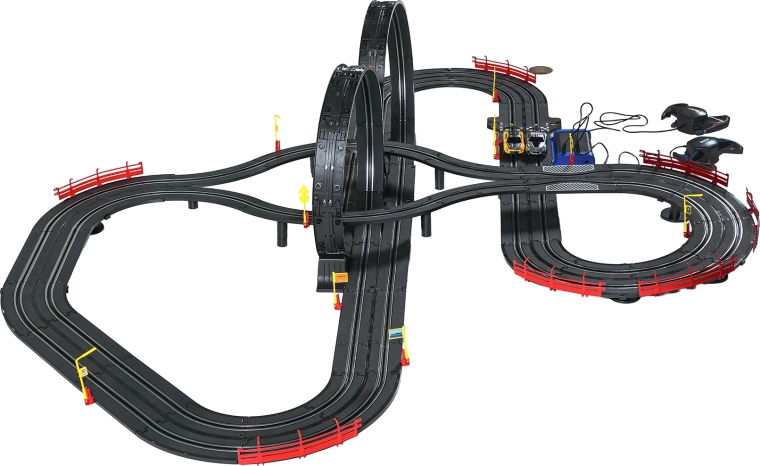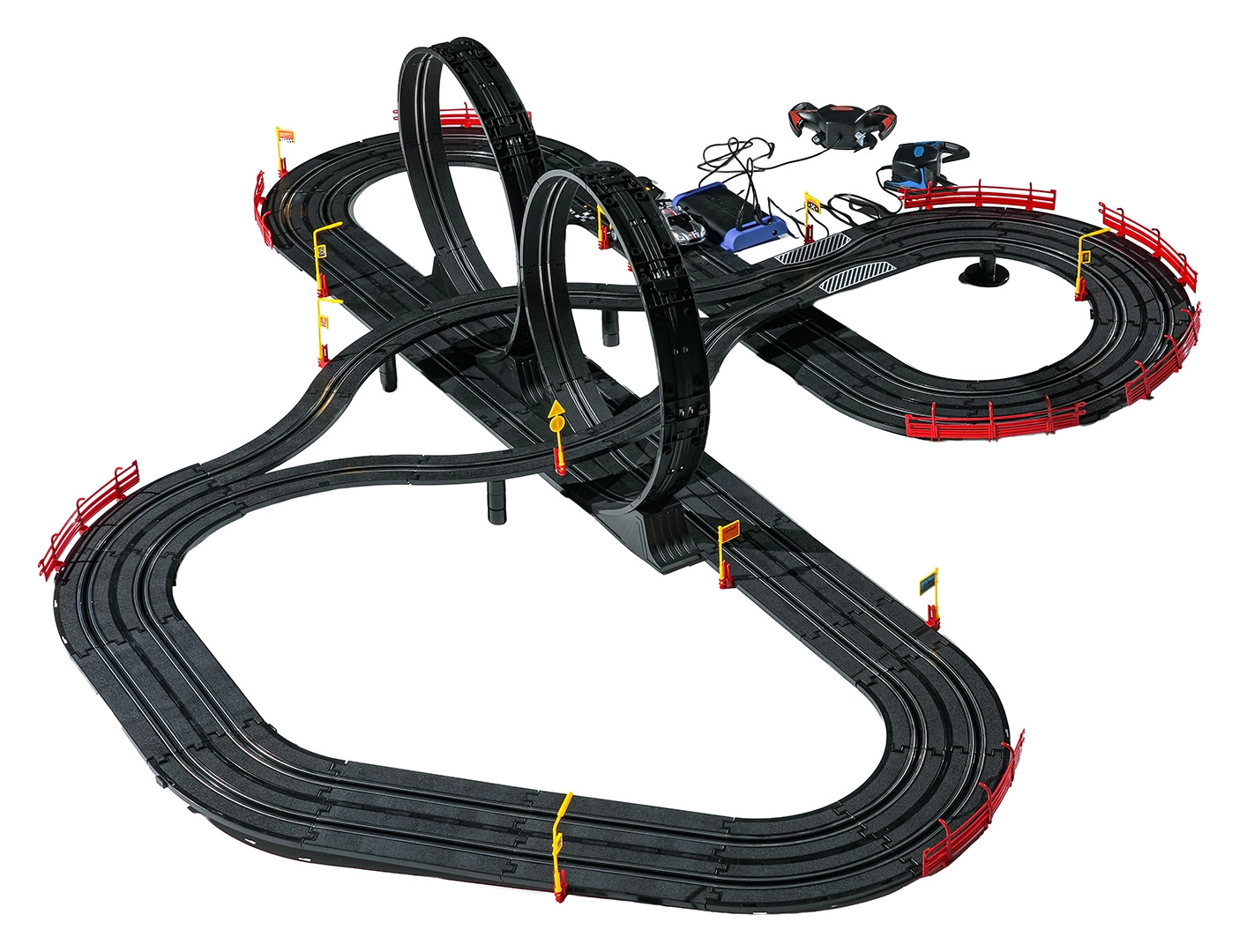 Ogromna električna staza za dvije osobe, duga do 790 cm, donosi dvostruke looping-e, oštre zavoje i duge ravnice za napete dvoboje. U pakiranju su 2 trkaća auta sa svjetlosnim efektima i 2 upravljača u obliku volana. Staza se može napajati adapterom 12 V (uključen) ili baterijama, pa možete juriti kad god i gdje god poželite.