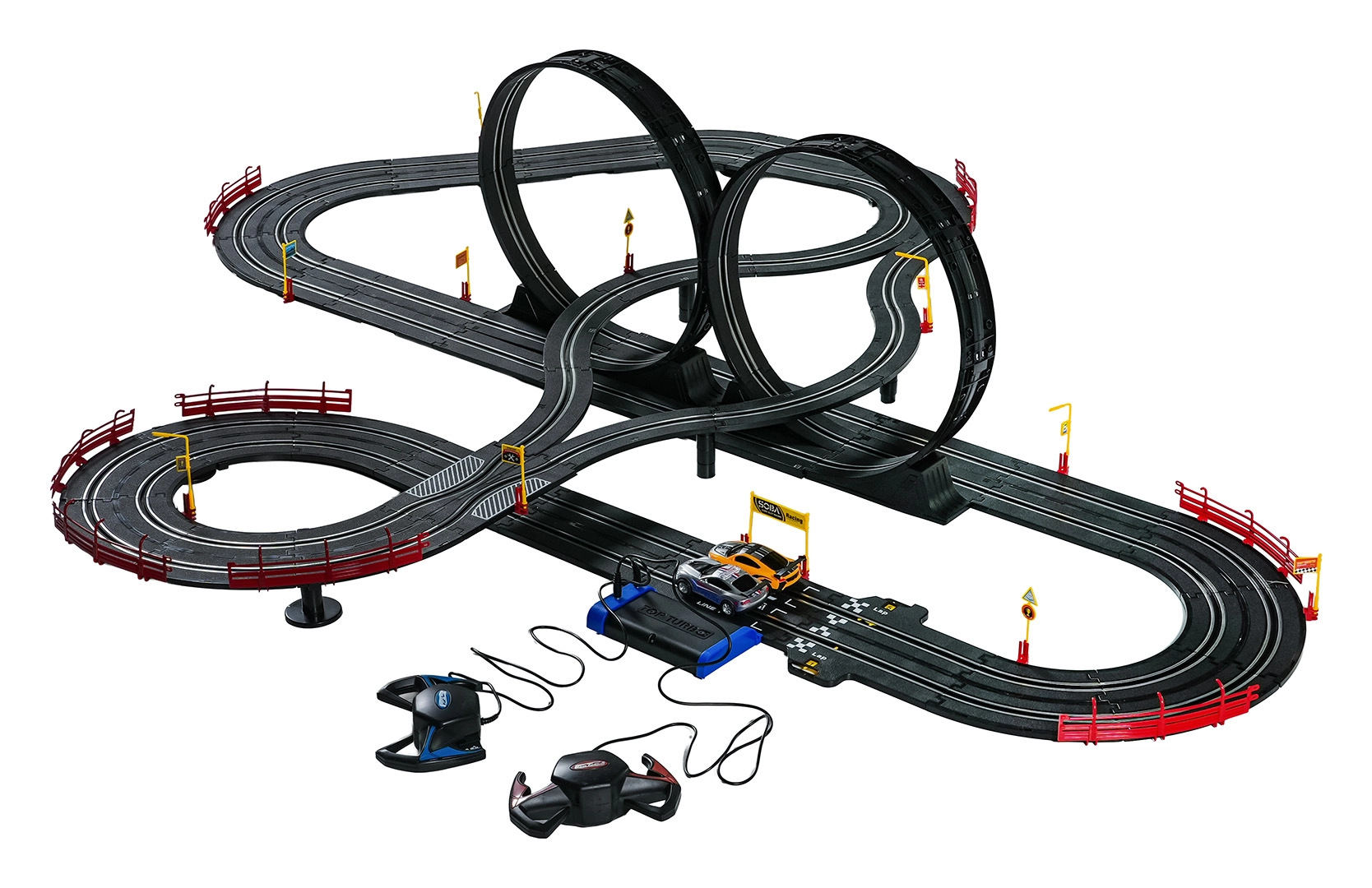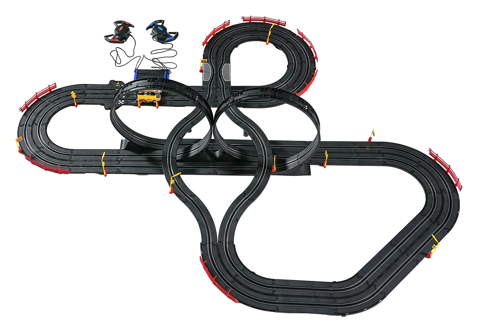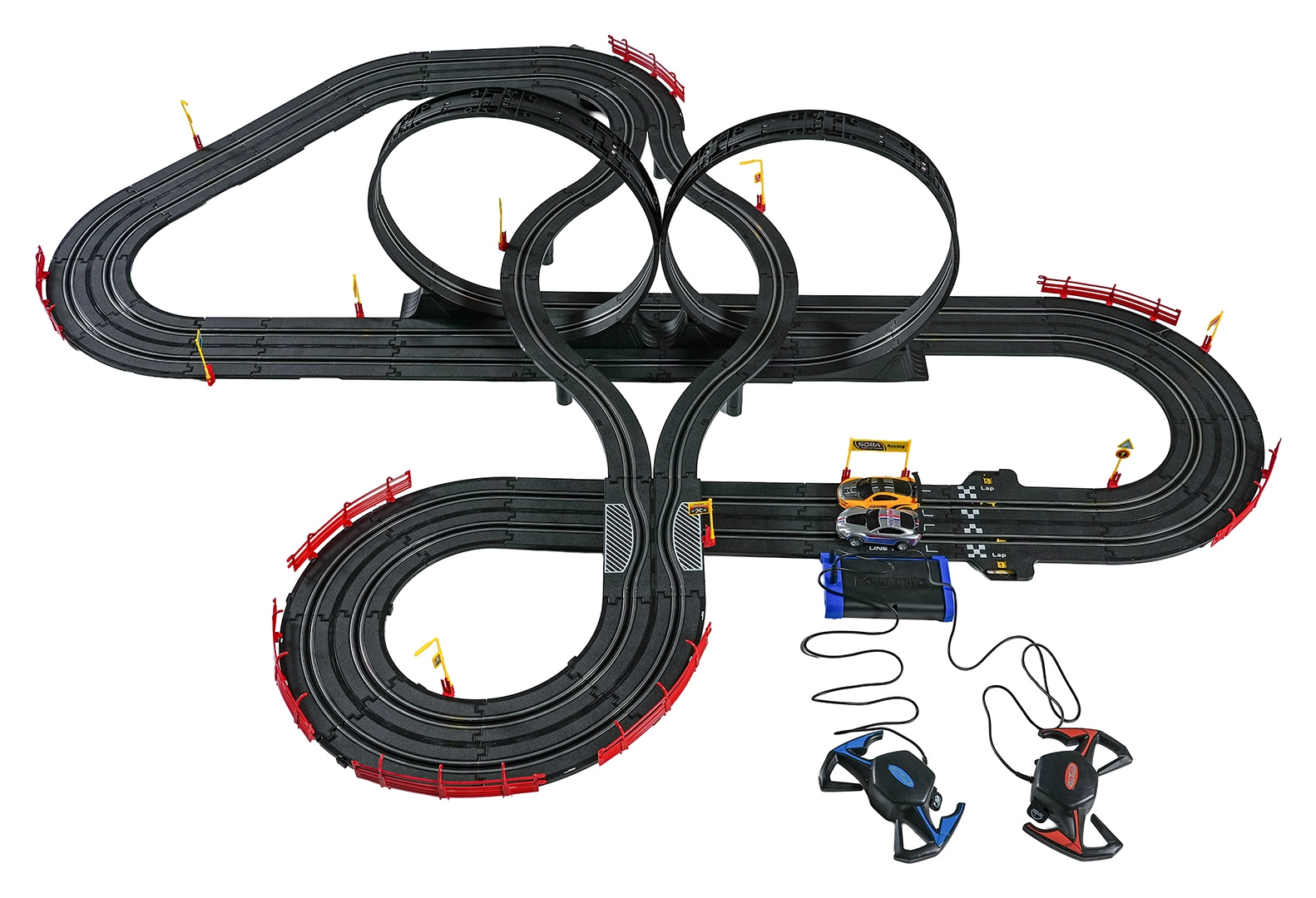 Ogromna električna staza za dvije osobe, duga do 790 cm, donosi dvostruke looping-e, oštre zavoje i duge ravnice za napete dvoboje. U pakiranju su 2 trkaća auta sa svjetlosnim efektima i 2 upravljača u obliku volana. Staza se može napajati adapterom 12 V (uključen) ili baterijama, pa možete juriti kad god i gdje god poželite.
