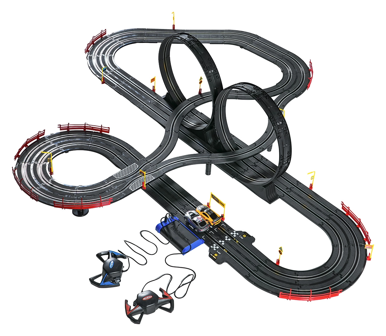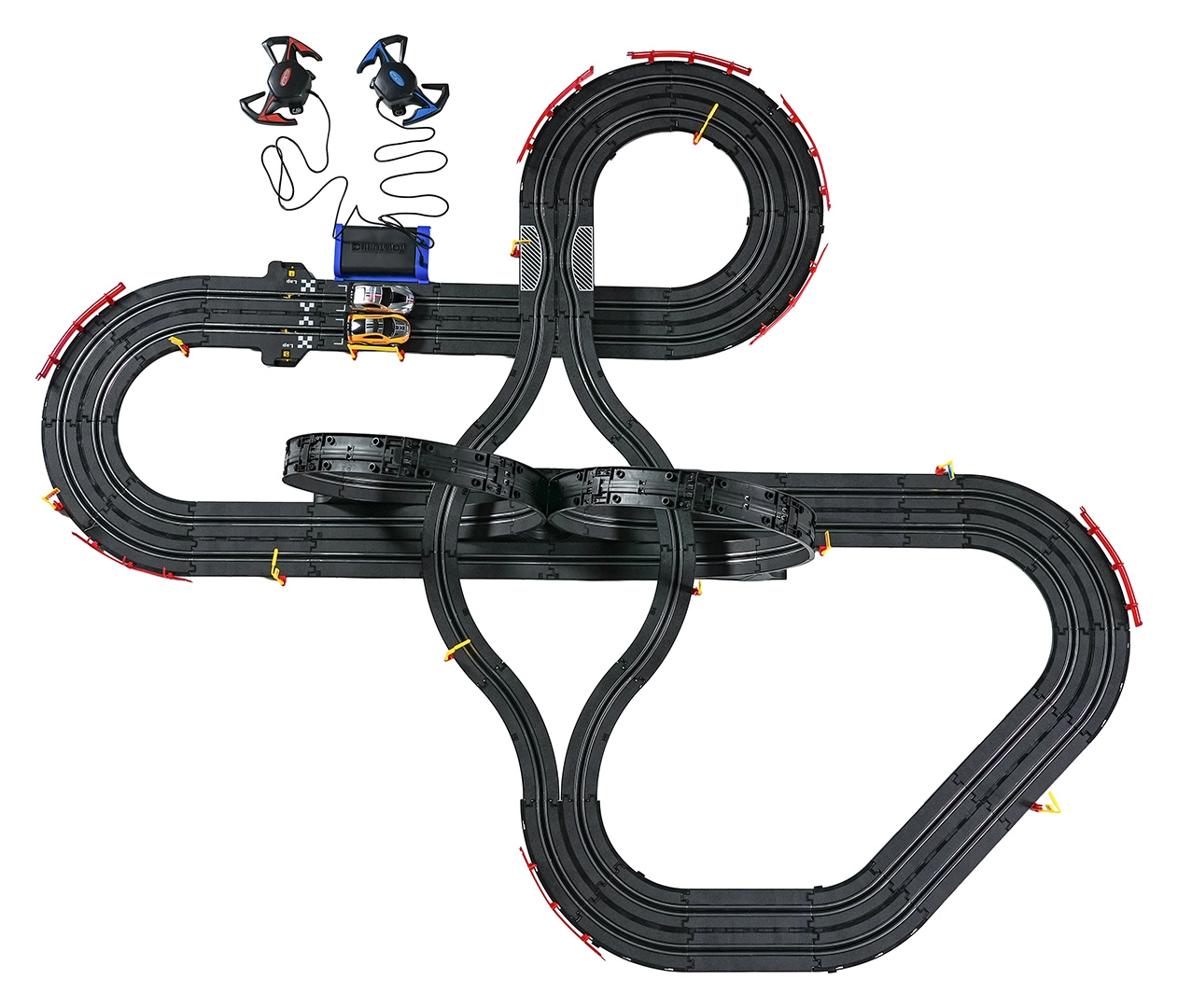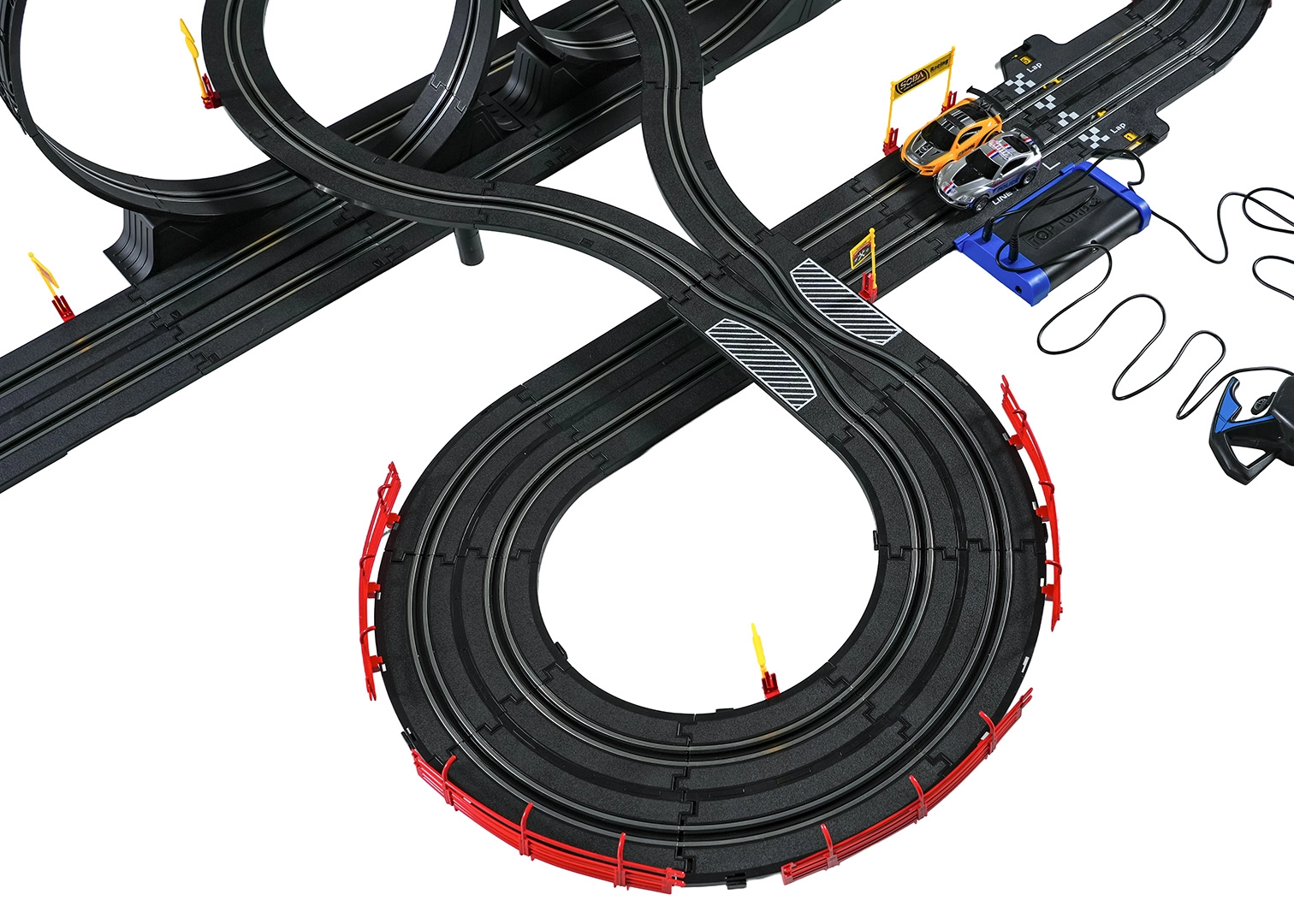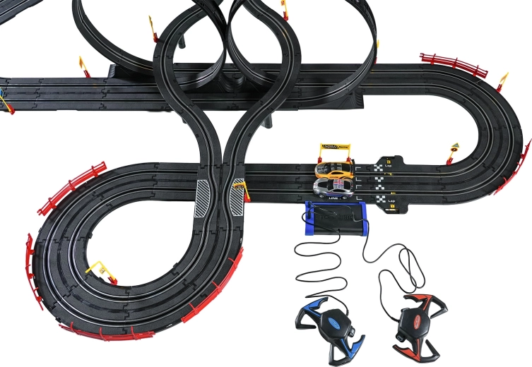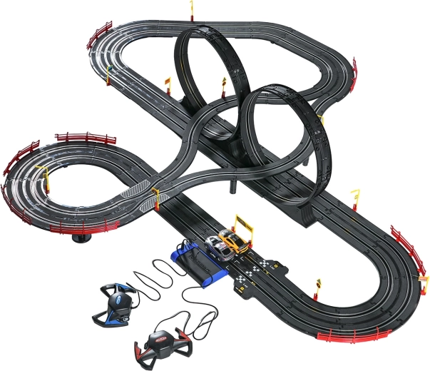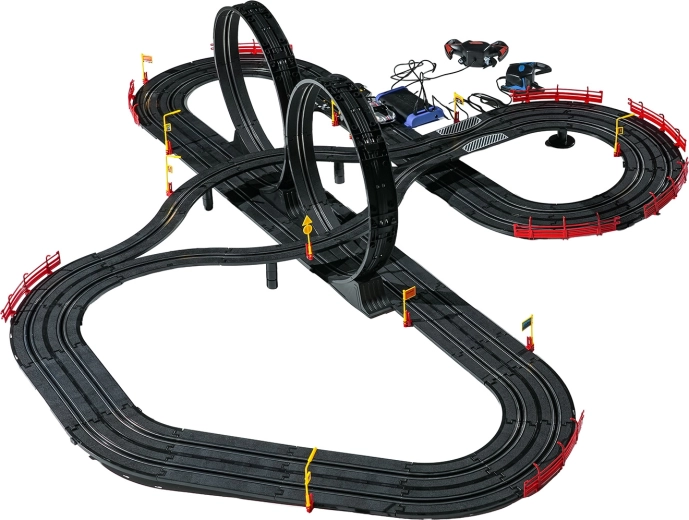 Modularni segmenti sa sigurnosnim ogradama omogućuju stabilnu vožnju i u najbržim dionicama. Dva upravljača mogu se spojiti na bazu ili napajati baterijama, pa imate slobodu utrkivati se po svojim pravilima. Zahvaljujući dugoj stazi, ima dovoljno prostora za pretjecanja, taktičnu vožnju i dramatične finiše.