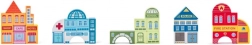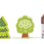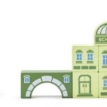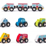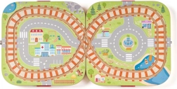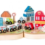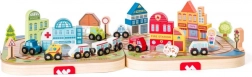 Ovaj drveni gradski set u kovčežiću idealan je za male istraživače. Nakon otvaranja dobivate kompletne gradske scene s bolnicom, vatrogasnom postajom, školom i policijom, cestama, prometnim znakovima, stabalima i životinjama. U kompletu su i drvena vozila na kotačima – vozilo hitne pomoći, vatrogasno vozilo, policijski auto, autobus i traktor – te trodijelni vlakić s magnetskim spajanjem.