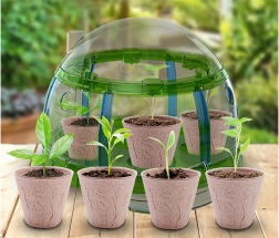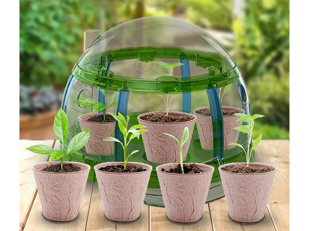 Stvorite kod kuće mali vrt i pratite rast od sjemenke do odrasle biljke. Dekorativni mini staklenik s krovom koji se otvara i vratima do svake teglice pruža idealne uvjete za klijanje. Biorazgradive teglice možete presaditi izravno u tlo – nježno prema prirodi i bez nereda.