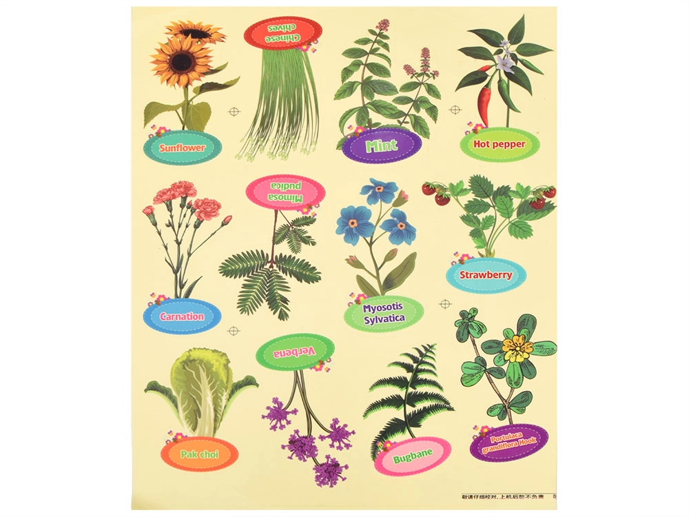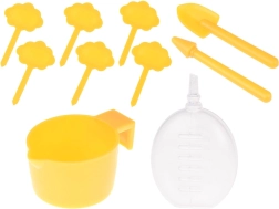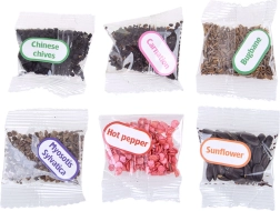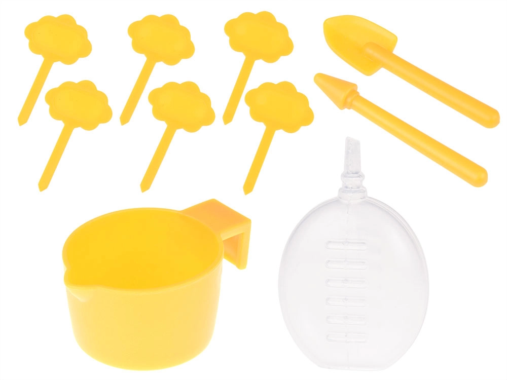 - 1× mini staklenik, 6× biorazgradiva teglica, 6× kokosov briket (Ø 30 mm), 6× oznaka za biljke, 1× lopatica, 1× sijaća špica, 1× čašica za zalijevanje, 1× set naljepnica (s nazivima i slikama biljaka), 1× set naljepnica s nazivima biljaka (na engleskom), 6× vrećica sa sjemenkama (netikavka, suncokret, trajnica, vlasac, karanfil, paprika), slikovni priručnik