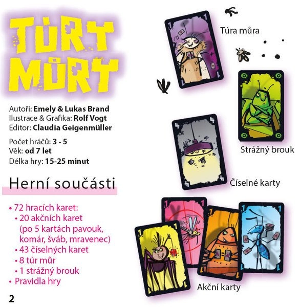72 igraće karte: 20 akcijskih karata (po 5 karata pauk, komarac, žohar, mrav), 43 brojčane karte, 8 karata túry múry, 1 čuvar-bubamara, pravila igre