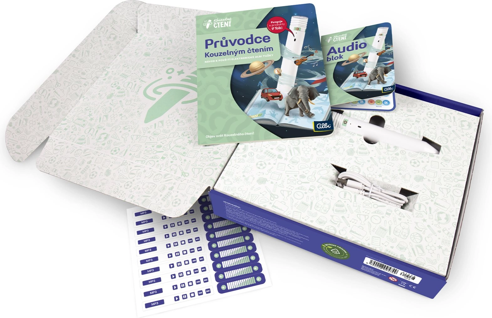 Dio osnovnog seta je sve za brzi start: elektronička olovka 2.0, Vodič kroz Čarobno čitanje, USB‑C kabel, Audioblok i naljepnice za