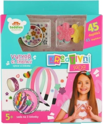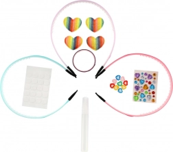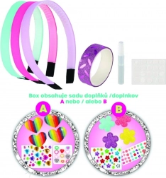- 3 osnovna obruča za kosu, 45 dekoracija (kamenčići, cvjetići, oblici, naljepnice i drugo)