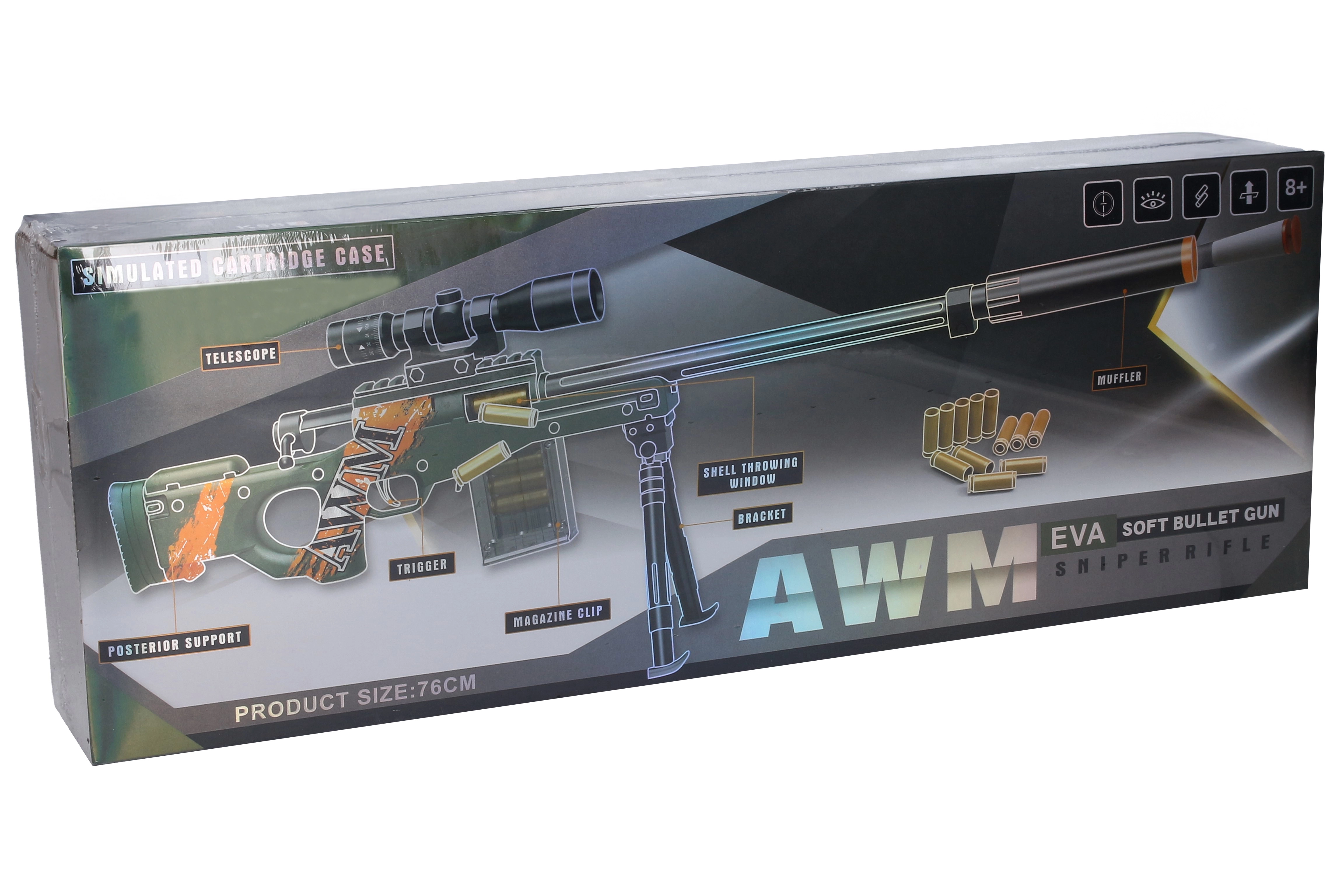 Realistična dječja puška inspirirana modelom AWM razveselit će male zaljubljenike u akcijske igre. Nudi rastavljivu konstrukciju, duljinu 76 cm, stalak, prigušivač i nišan za bolje ciljanje. U pakiranju se nalazi 10 patrona i 10 pjenastih metaka. Na stražnjoj strani pakiranja pronaći ćete slikovni priručnik za sastavljanje i korištenje.