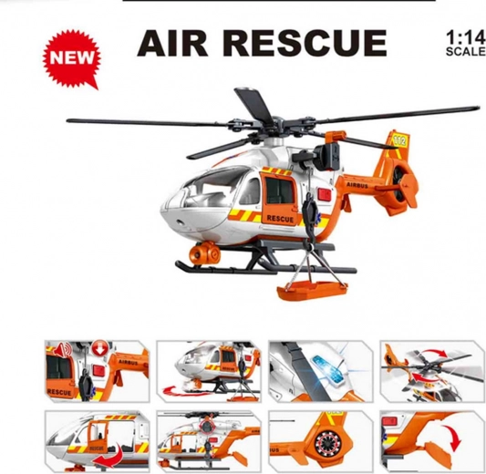 Djeca će cijeniti otvarajuća bočna vrata i stražnju klapnu, pomičnu kuku s transportnom košarom te sklopive i rotirajuće rotore. LED osvjetljenje sprijeda, na vrhu i u kokpitu zajedno s autentičnim zvukovima leta i alarma pojačava atmosferu spasilačkih akcija. Helikopter se napaja 2× AAA baterijama (u pakiranju).