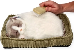 Mačiće ima pahuljasto plišano krzno i leži u udobnom ležaju, što stvara autentičan dojam mirnog sna.
