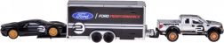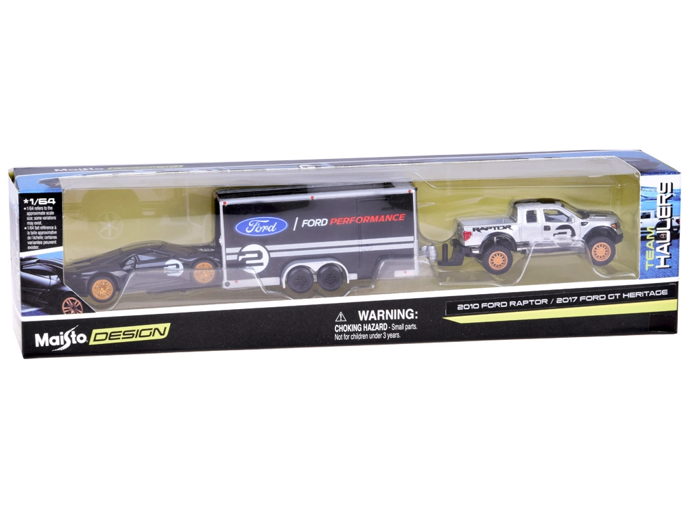 Stilski kolekcionarski set Maisto u mjerilu 1:64 spaja robusni FORD Raptor s odvojivom prikolicom i kultni trkaći FORD GT Heritage. Modeli imaju metalnu karoseriju, gumene kotače i detaljan tisak. Idealan za kolekciju i igru – prikolica ima funkcionalnu rampu, a Raptor vučnu kuku za realističan prijevoz. Metalna izrada, gumeni kotači, funkcionalna prikolica s rampom i detaljna licencirana izvedba oduševit će svakog ljubitelja automobila.
