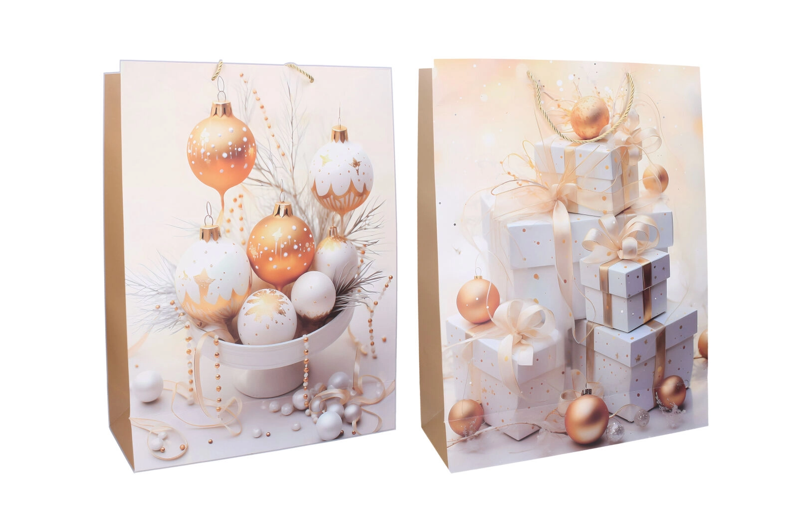 Stilska darovna vrećica u veličini XL idealna je za veće božićne poklone. Nudi čvrstu izradu, dovoljno prostora i svečani dizajn. Možete birati između 2 varijante s božićnim motivom dimenzija 40 × 55 × 15 cm.