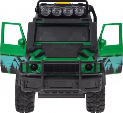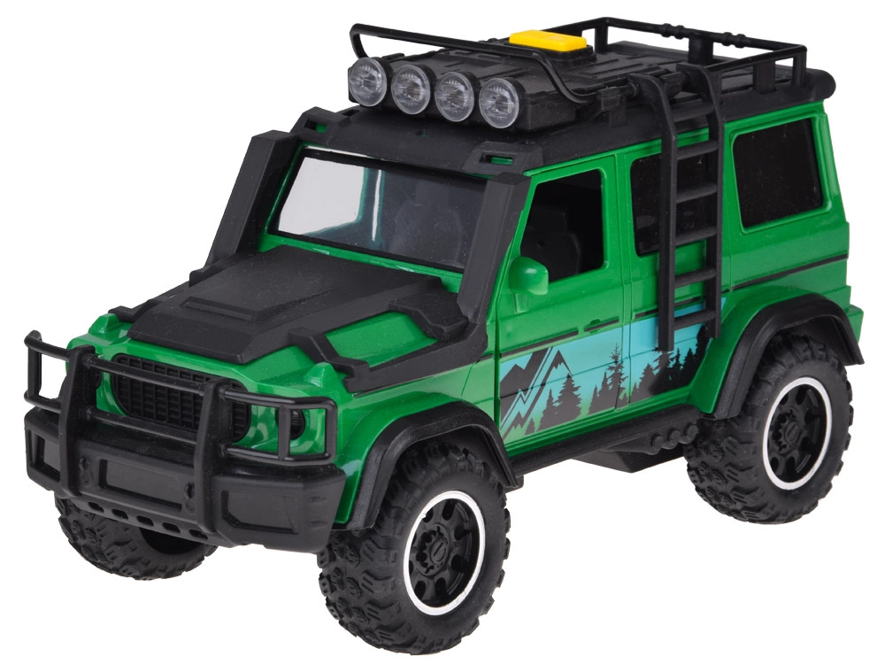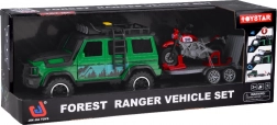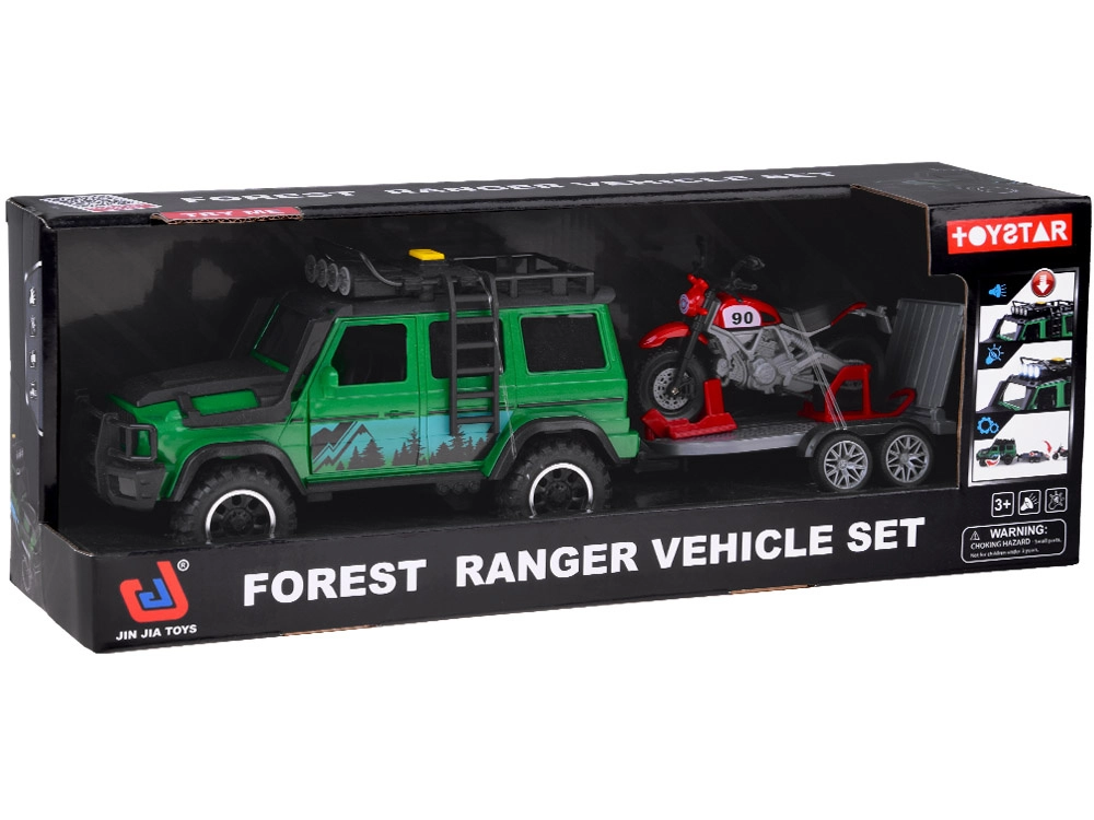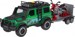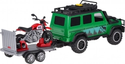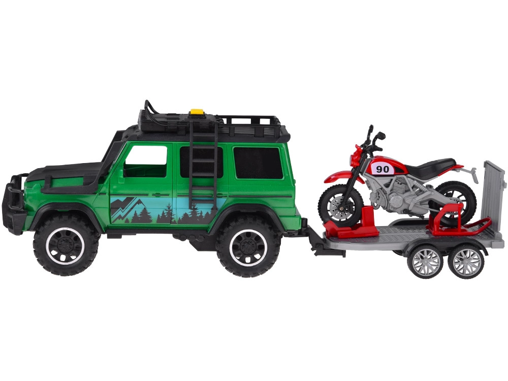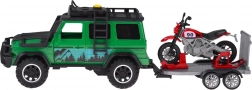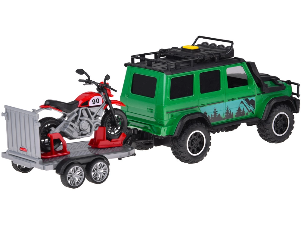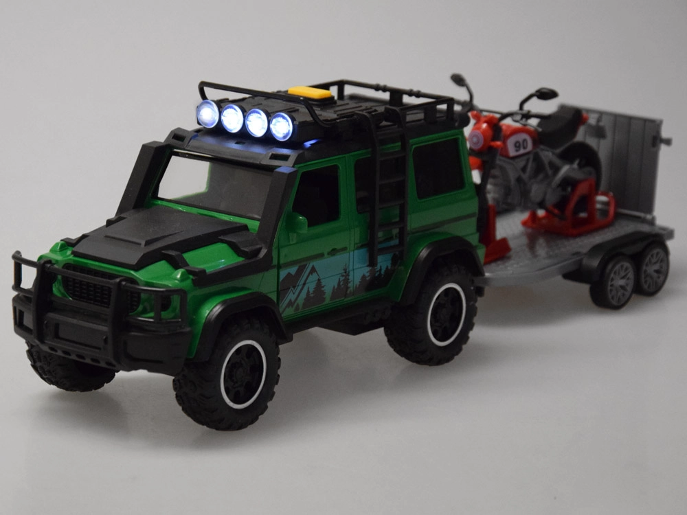 Avanturistički set za male vozače: zeleno terensko vozilo s odvojivom prikolicom–platom i crvenim sportskim motorom. Vozilo nudi svjetlosne i zvučne efekte, otvoriva vrata i gumene kotače za glatku vožnju. Prikolica ima preklopnu stražnju rampu za lako ukrcavanje i siguran prijevoz motocikla. Idealno za kreativnu igru i prijevoz drugih omiljenih igračaka.