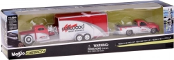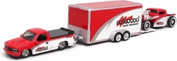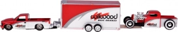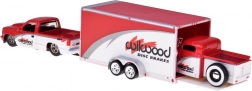 Stilski kolekcionarski set u mjerilu 1:64 donosi legendarni CHEVROLET 454 SS Pick-up 1993 i klasiku CHEVROLET Pick-up 1936 na transportnoj prikolici. Modeli u crveno-bijeloj izvedbi imaju metalnu karoseriju, gumene gume za glatku vožnju i detaljne otiske. Pick-up 454 SS opremljen je odvojivom kukom za vuču, prikolica se lako priključuje i isključuje – idealno za zabavu i vitrinu.