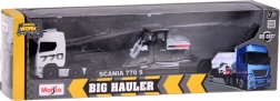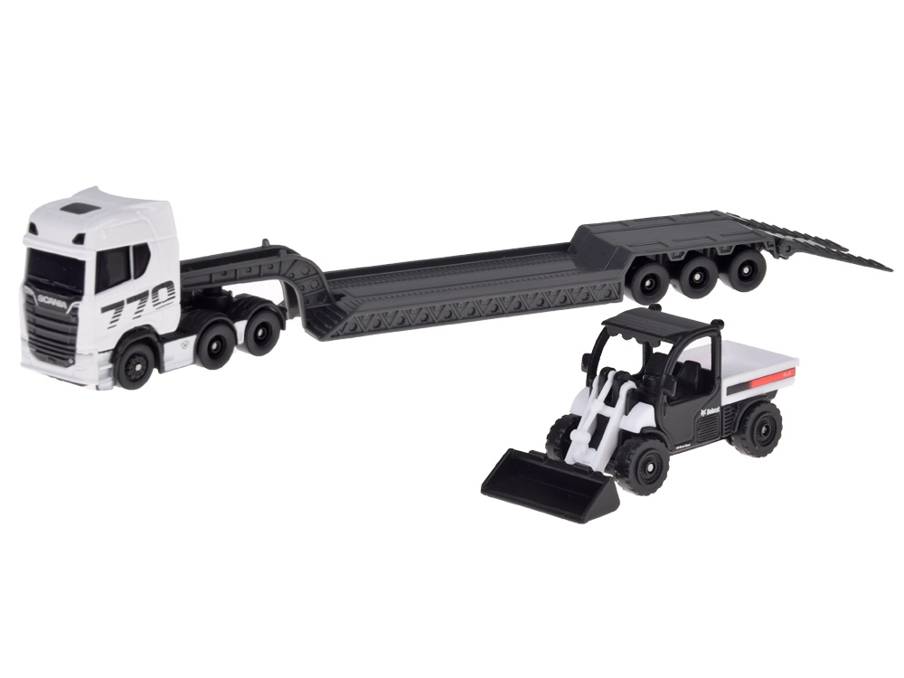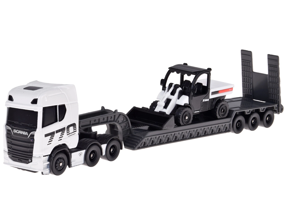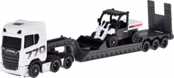 Otkrijte realističnu garnituru SCANIA 770S s niskopodnom poluprikolicom i funkcionalnim utovarivačem koja impresionira vjernom obradom detalja i atraktivnom bijelo–sivom kombinacijom. Metalno šasije kabine i kvalitetni plastični dijelovi podvozja osiguravaju izdržljivost i pri čestoj igri.
