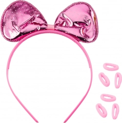 Stilizan ružičasti set dodataka za male modne ljubiteljice sadrži dječje naočale razigranog oblika, traku za kosu s velikom mašnom i 6 gumica za kosu. Lagana i sigurna izvedba idealna je za svakodnevno nošenje, igru stilistice i princezine kostime.