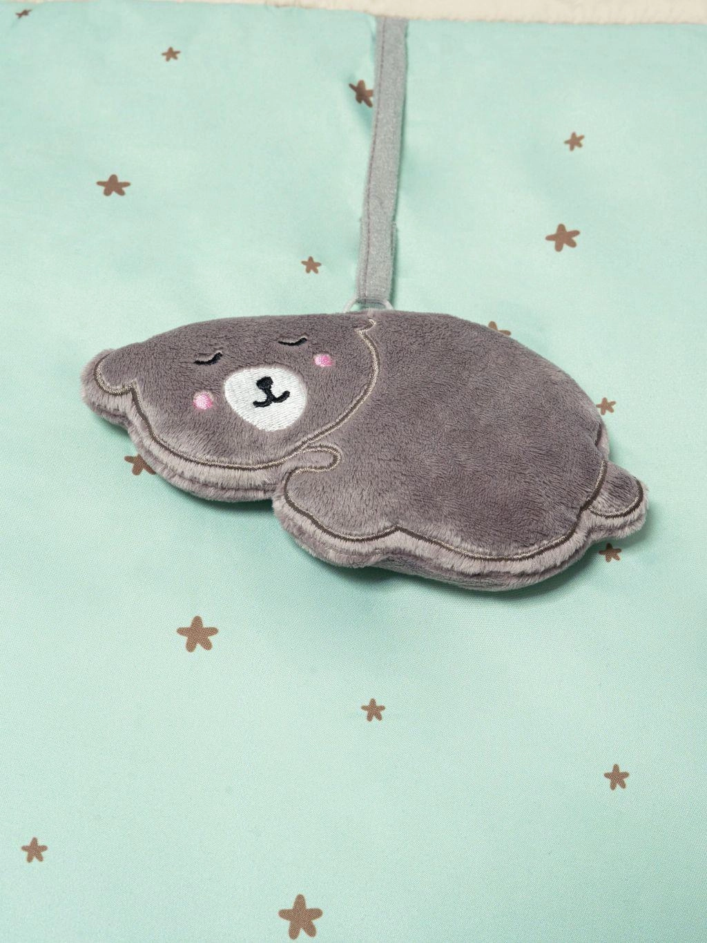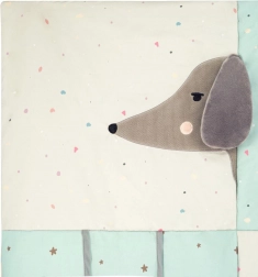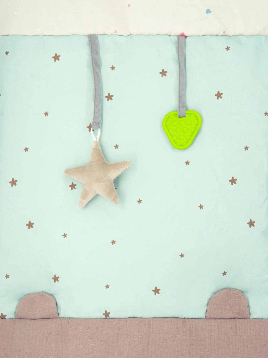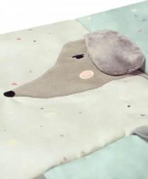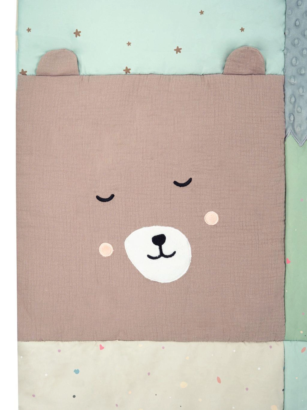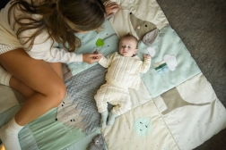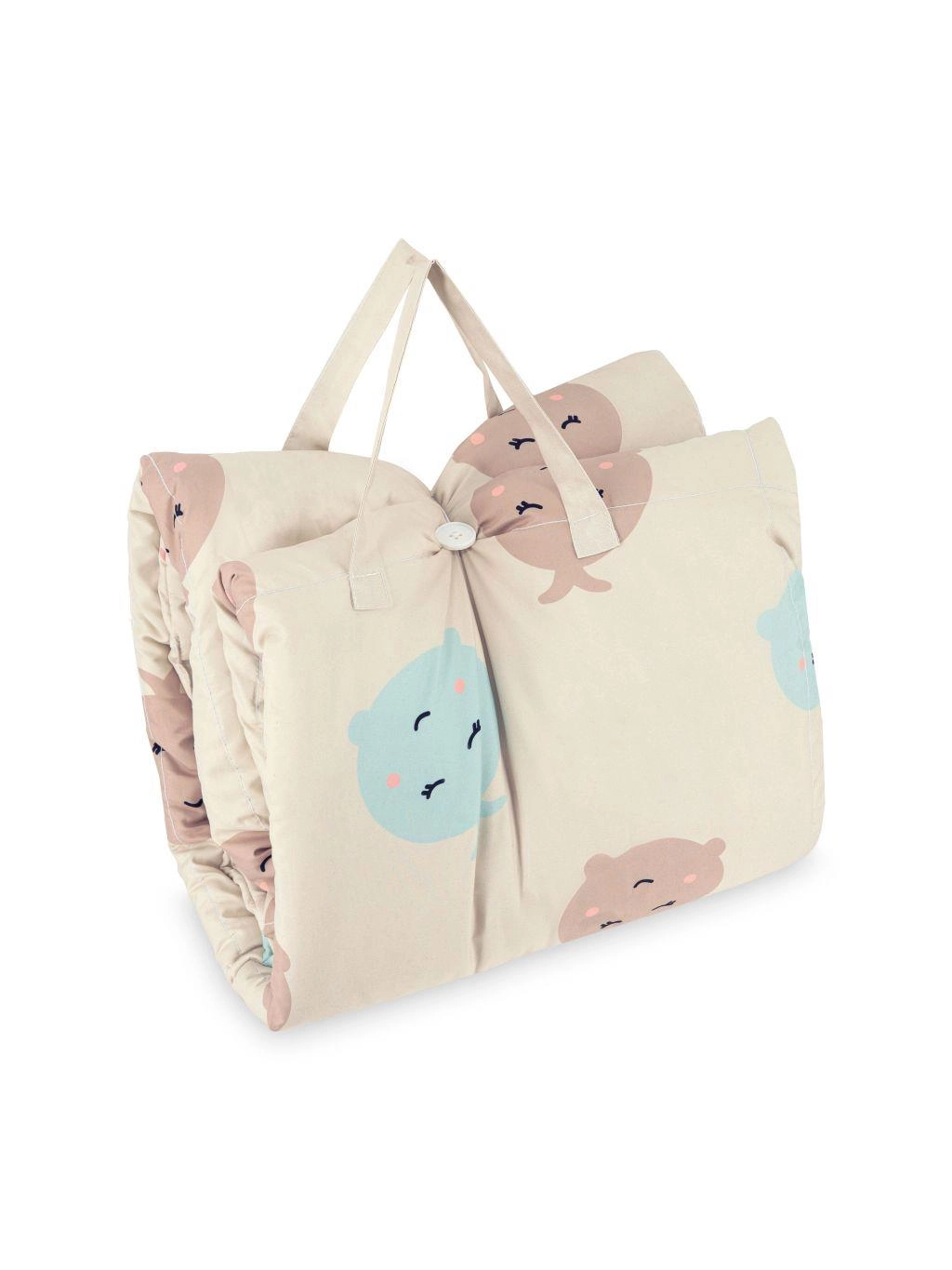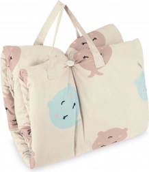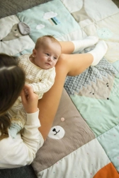 Praktična konstrukcija omogućuje da dekicu složite u torbu i osigurate gumbićima – tako je lako prenijeti na piknik, u park ili na plažu. Nježne, prigušene boje ne ometaju i pomažu djetetu uočiti pojedine elemente, poput životinjica i simpatičnih medvjedića MoMi. Proizvod zadovoljava norme EN 71-1/2/3 i prikladan je za djecu od rođenja.