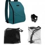 U setu dobivate sve potrebno: stylish ruksak za kolica, držač za piće, mrežu protiv komaraca i navlaku za kišu. Opcijski spojni set adaptera omogućuje povezivanje dvaju kolica u praktično rješenje za braću/sestru ili blizance. Ne nedostaju 5-točkasti sigurnosni pojasevi i prostrana košara s nosivošću 2 kg.