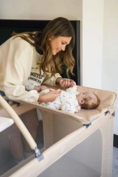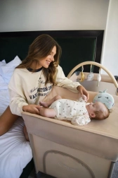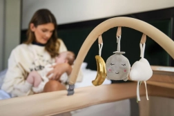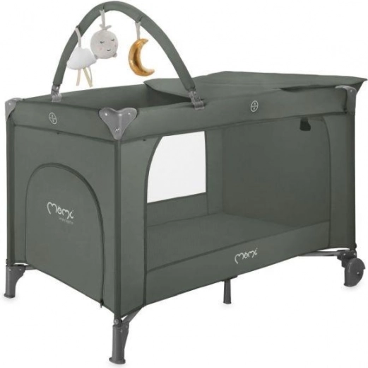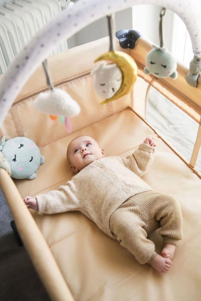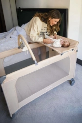 Dve razine spavanja podržavaju siguran san od rođenja: gornji ležaj za novorođenčad do 9 kg, donji za malu djecu do 15 kg. Bočni ulaz na patent razveselit će znatiželjnu djecu, a kotačići omogućuju lako premještanje po prostoriji. U kompletu su mekani madrac, odvojiva igračka prečka s igračkama i praktičan pult za previjanje za brzo presvlačenje.
