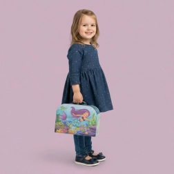 U setu su čajnik, šalice, tanjurići i poslužavni pladanj usklađeni u nježnim morskim nijansama s ilustracijama vila, koralja i ribica. Praktični metalni kovčežić osigurava red, lako prenošenje i zaštitu cijelog seta – savršeno kao poklon za djecu od 3 godine.