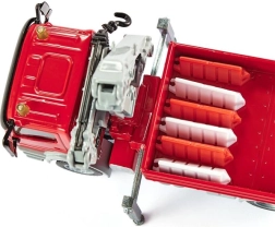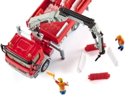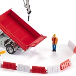 Model nudi bogate funkcije: okretna i zglobna dizalica s kukom, kiperska karoserija za utovar/istovar te izvlačne stabilizacijske potpore za sigurno podizanje tereta. Gumeni kotači glatko se kotrljaju po raznim podlogama, a dodaci u obliku figura i barijera proširuju mogućnosti igre i potiču maštu.