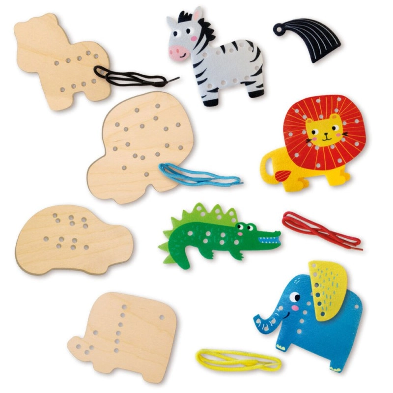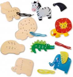 Ovaj simpatičan set za provlačenje s motivima džungle idealan je za predškolsku djecu. Zahvaljujući šarenim vezicama i životinjskim figuricama, djeca treniraju provlačenje i vezanje, razvijaju finu motoriku i uče se koncentraciji. Drvene pločice s motivima životinja (slon, krokodil, lav, zebra) nude različite oblike i razine zahtjevnosti.