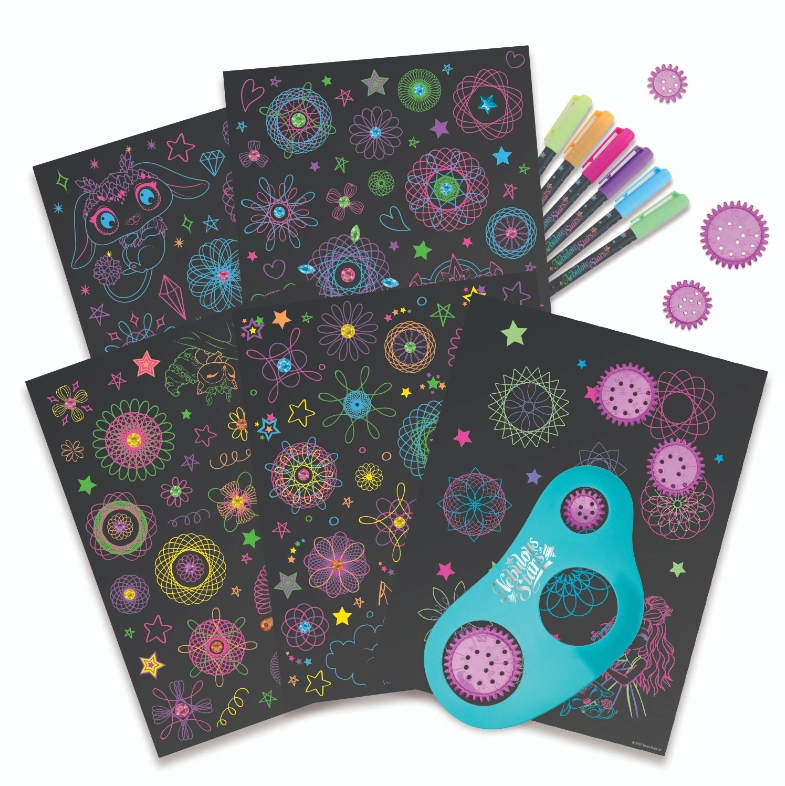 - Jednostavno i zabavno – umetnite kotačić u šablonu, crtajte neonskom olovkom i promatrajte kako nastaju fascinantne spirale.