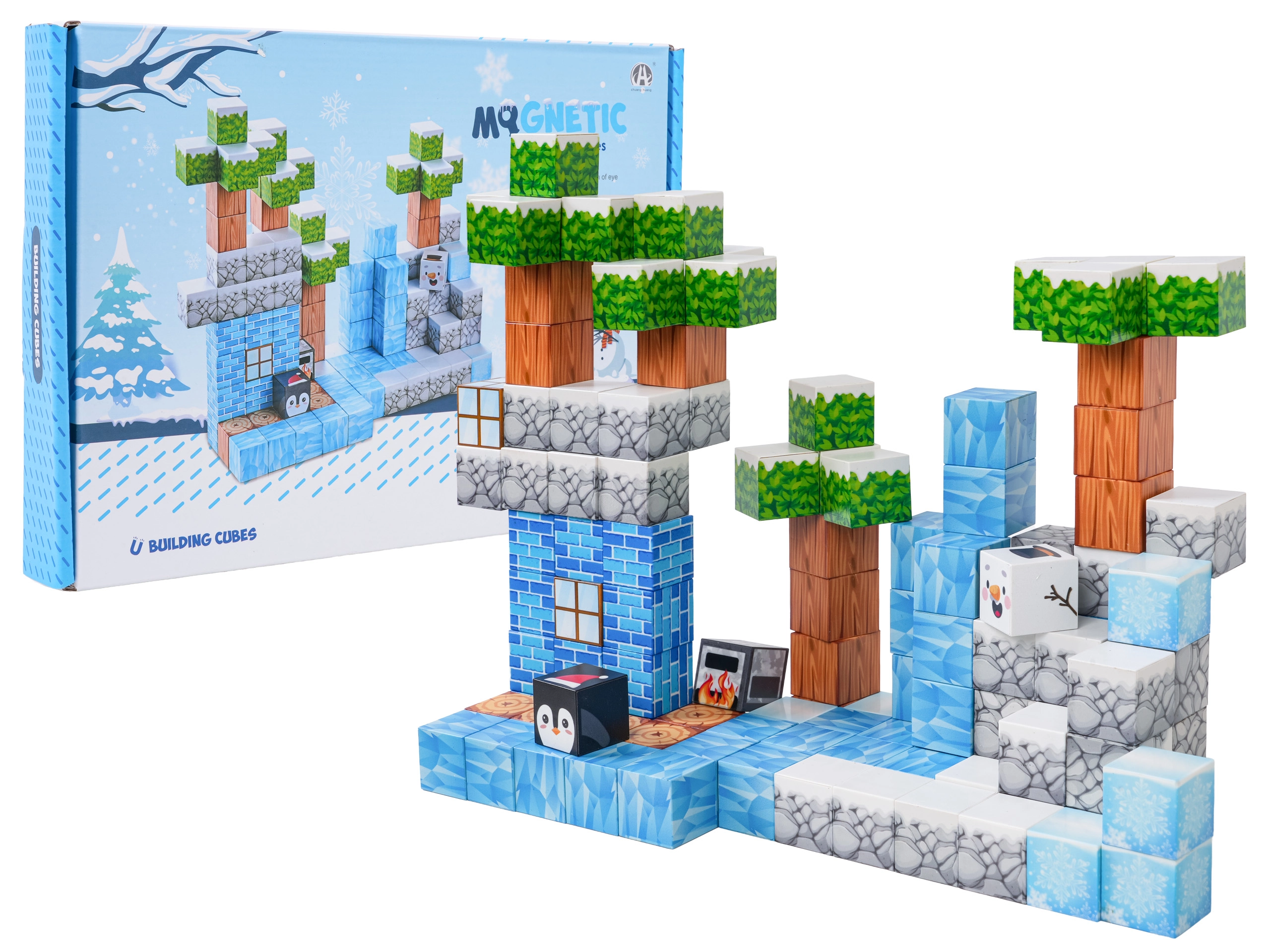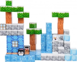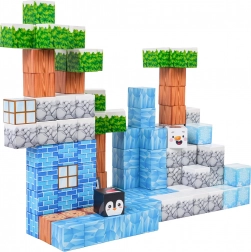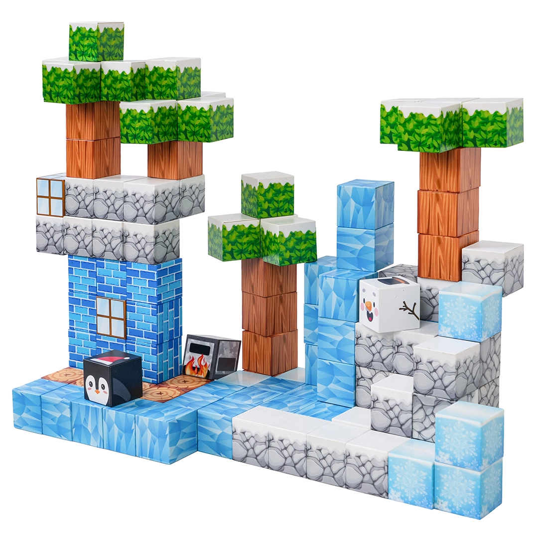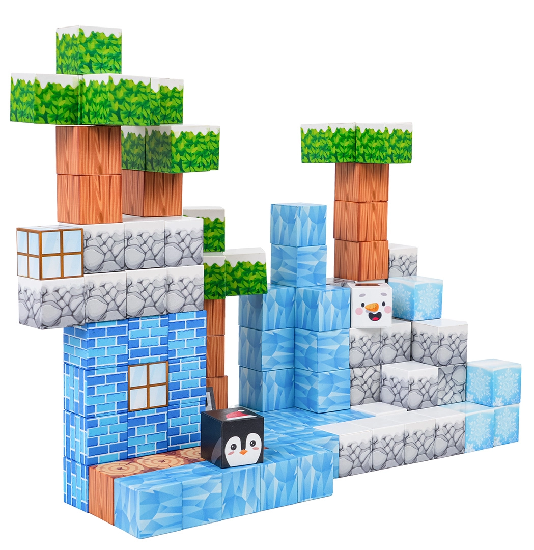 Ovaj bogati set za slaganje nudi djeci beskrajne mogućnosti gradnje – od zimskih scena do originalnih terena i građevina. Kocke s otisnutim teksturama (led, drvo, kamen, cigle, zelenilo) sigurno i čvrsto se spajaju zahvaljujući neodimijskim magnetima, pa modeli zadržavaju oblik i tijekom dulje igre.