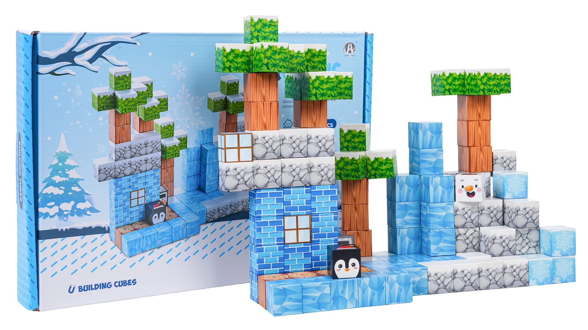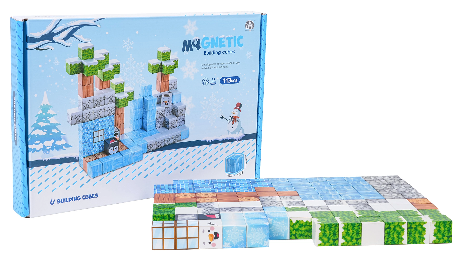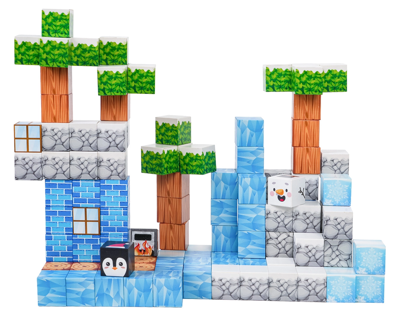 Ovaj bogati set za slaganje nudi djeci beskrajne mogućnosti gradnje – od zimskih scena do originalnih terena i građevina. Kocke s otisnutim teksturama (led, drvo, kamen, cigle, zelenilo) sigurno i čvrsto se spajaju zahvaljujući neodimijskim magnetima, pa modeli zadržavaju oblik i tijekom dulje igre.