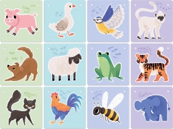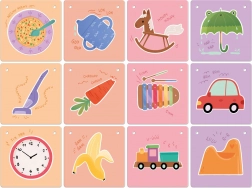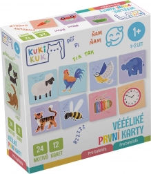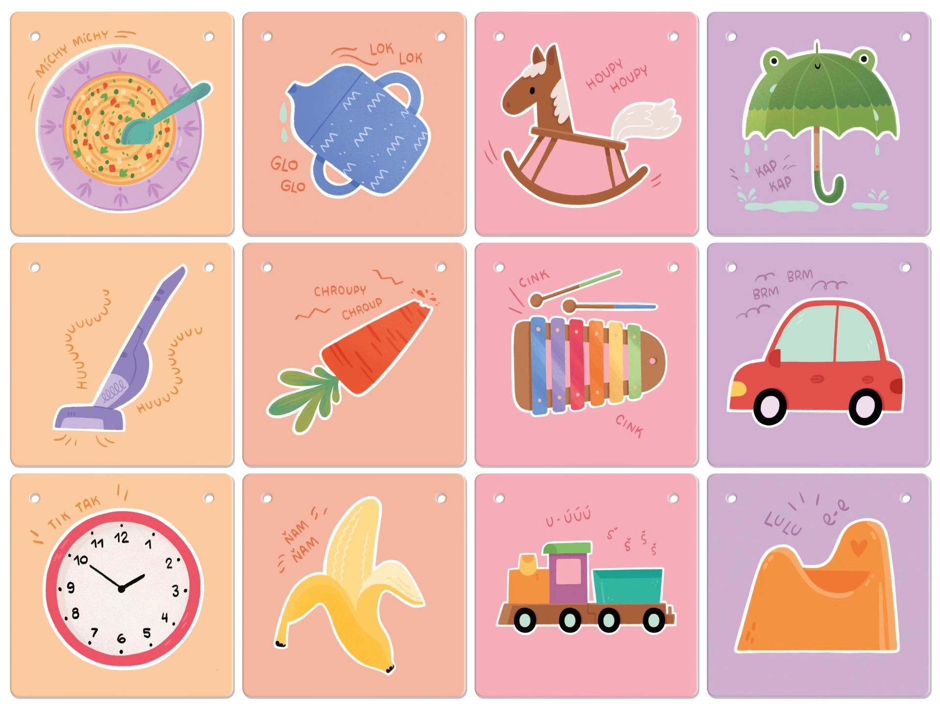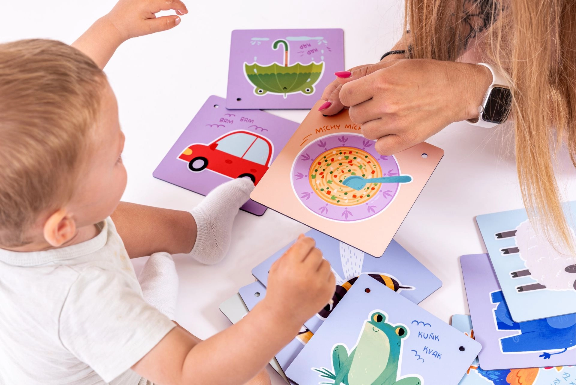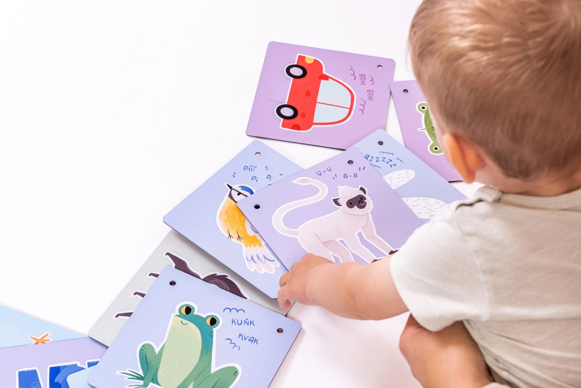 U razdoblju od 12 do 30 mjeseci razvoj govora najviše je pod utjecajem oponašanja zvukova. Ponavljanje zvukova jača motoriku govornih organa (usne, jezik, meko nepce), pomaže u doživljavanju melodije i tempa jezika te gradi temelje rječnika. Kartice tako odlično služe kao most od zvukova do prvih riječi.