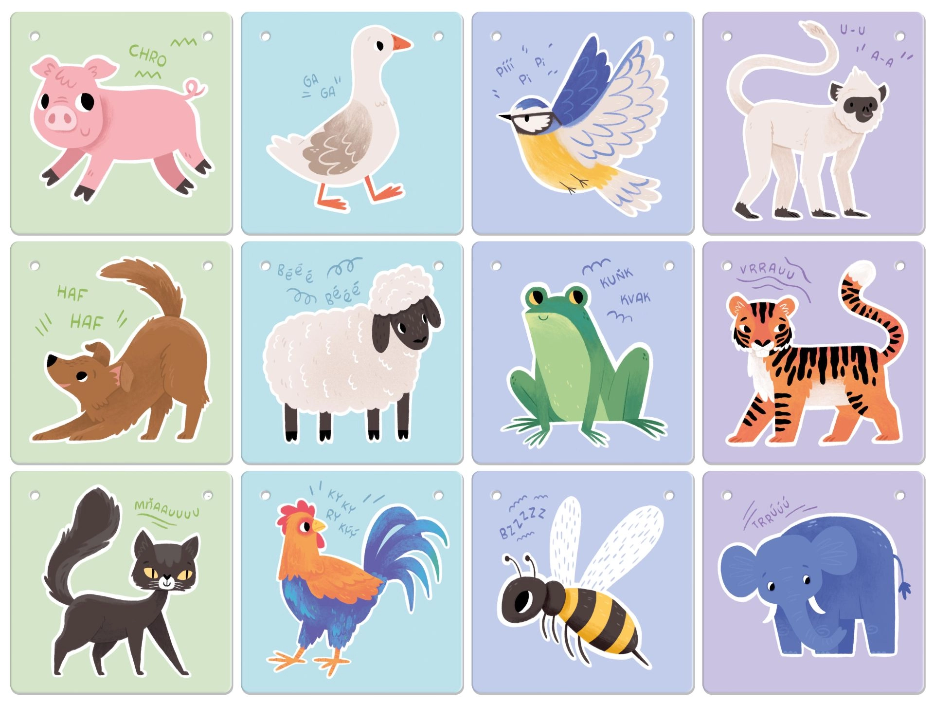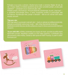 Ovaj set kartica velikog formata osmišljen je za razigranu stimulaciju govora u razdoblju kada djeca najprije oponašaju zvukove, a tek potom stvaraju riječi. Jasne, razumljive ilustracije s grafičkim naputkom motiviraju djecu na ponavljanje zvukova poput “mijau”, “brm” ili “vau”, čime prirodno uvježbavaju slušnu diskriminaciju, pamćenje i ritam jezika.