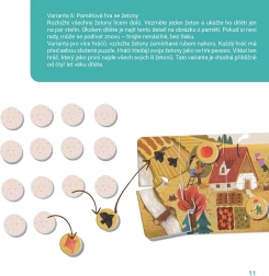 Djeca samostalno otkrivaju, razvrstavaju i pridružuju žetone gotovim slikama. Razvijaju zapažanje, logičko razmišljanje i rječnik.