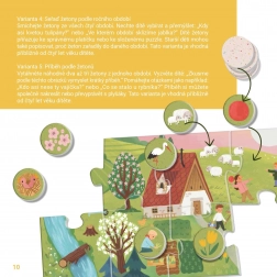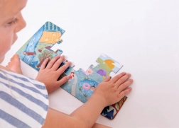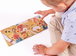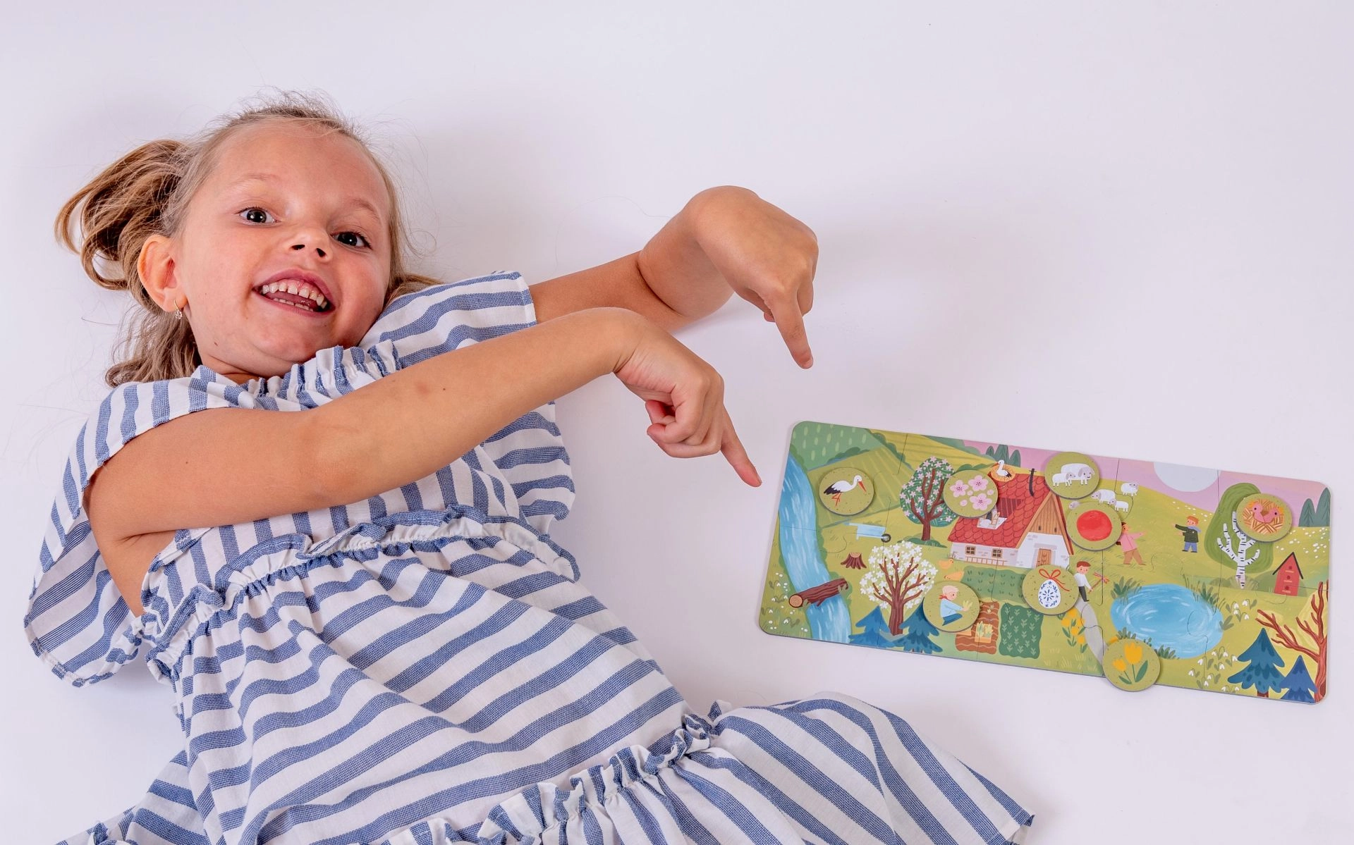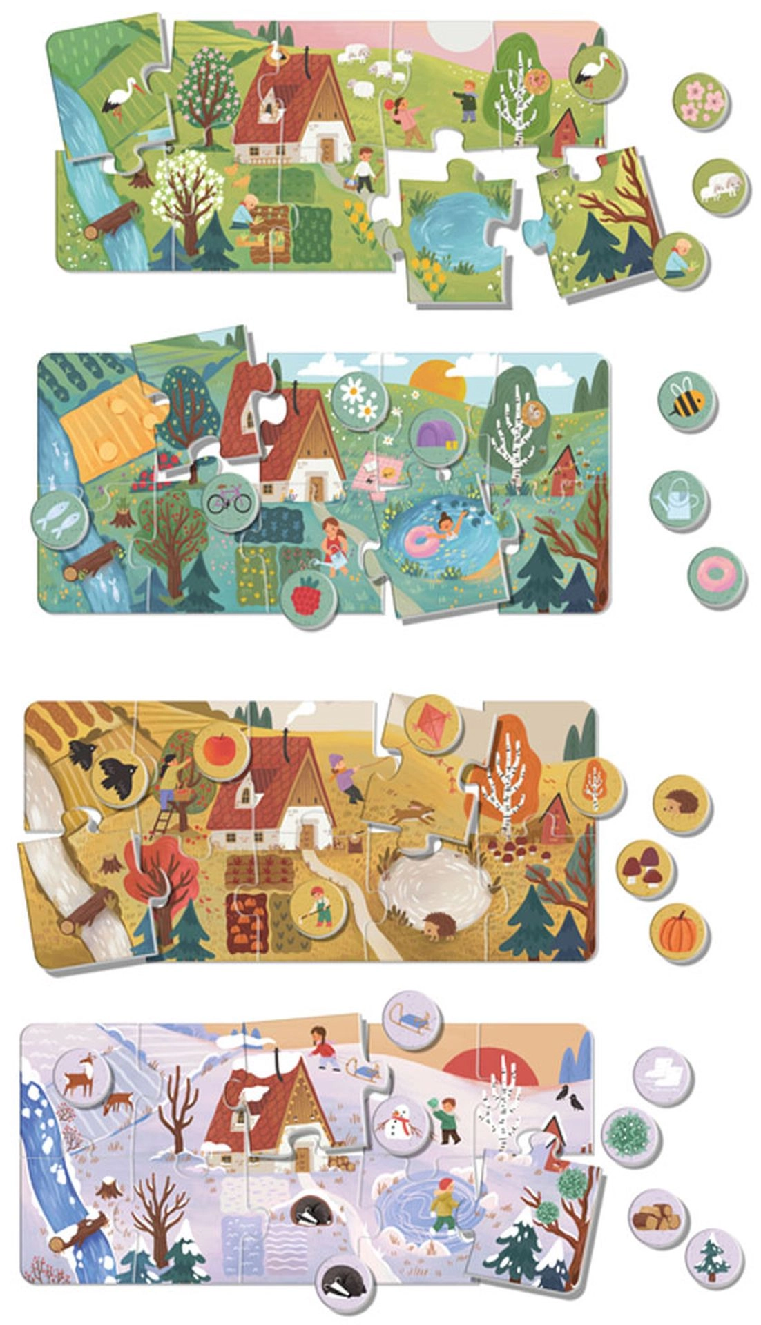 Velike puzzle loto godišnja doba KukiKuk donose djeci četiri prekrasne scene – proljeće, ljeto, jesen i zimu. Svako doba djeca slažu od 10 velikih dijelova, a zatim pridružuju 8 okruglih žetona s tipičnim motivima. Zahvaljujući Montessori principima, djeca samostalno otkrivaju, razvrstavaju i povezuju elemente prema osjetilnom doživljaju.