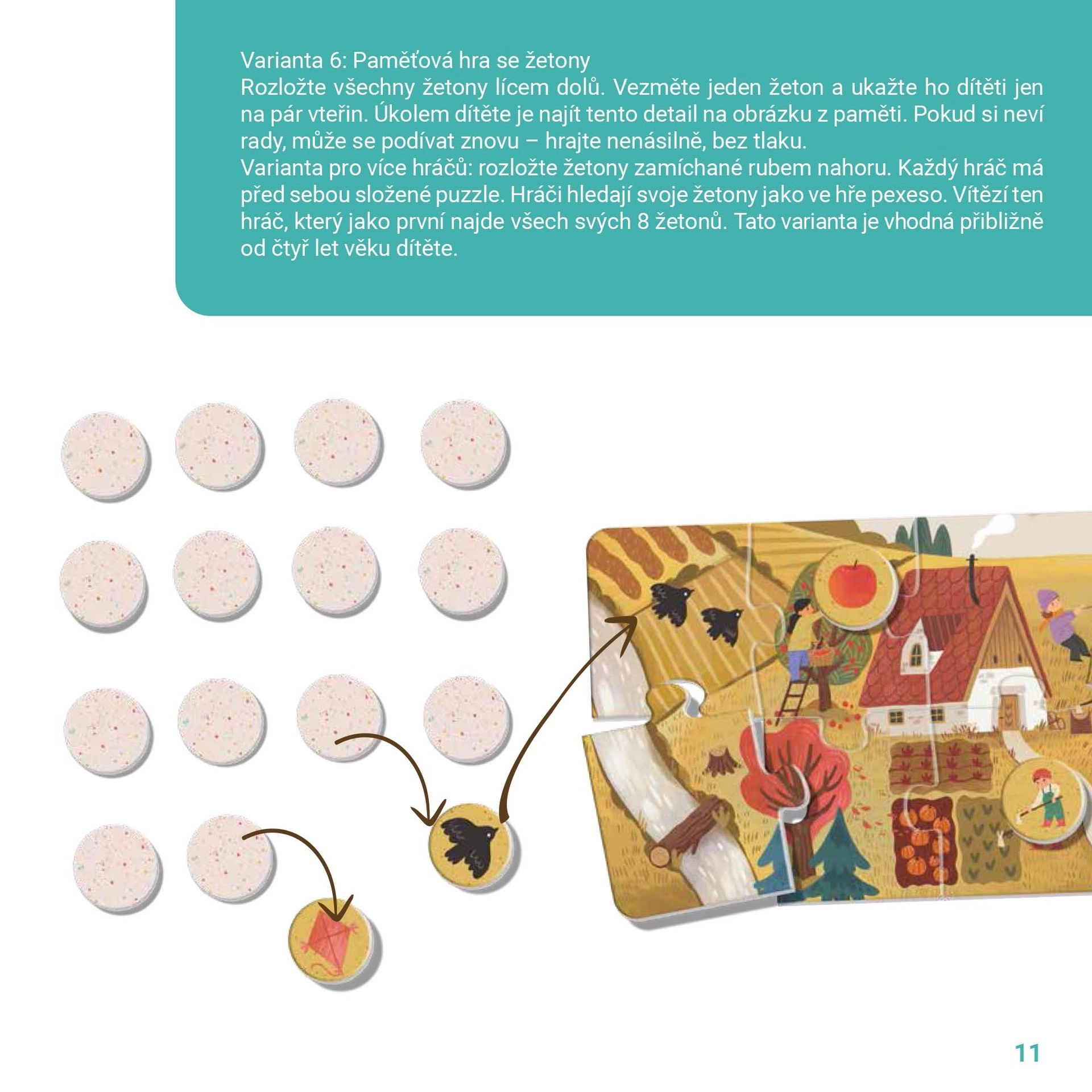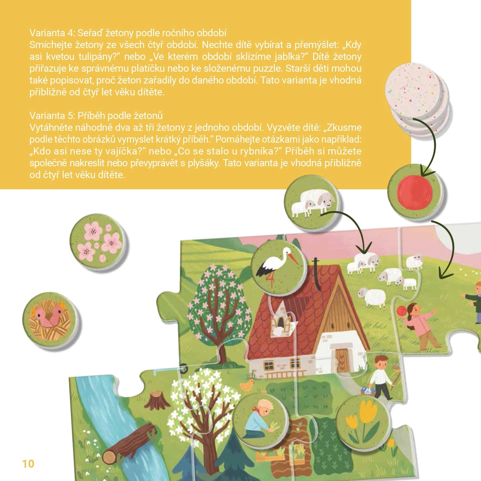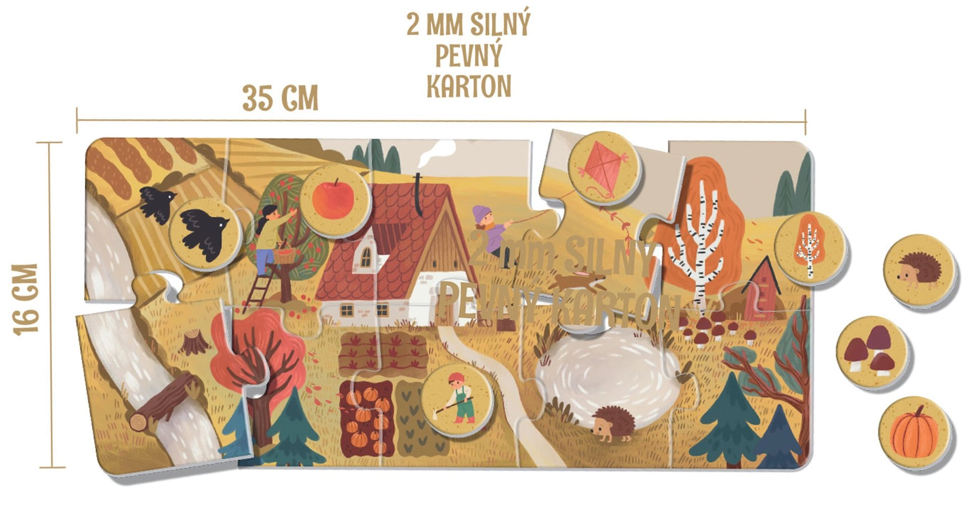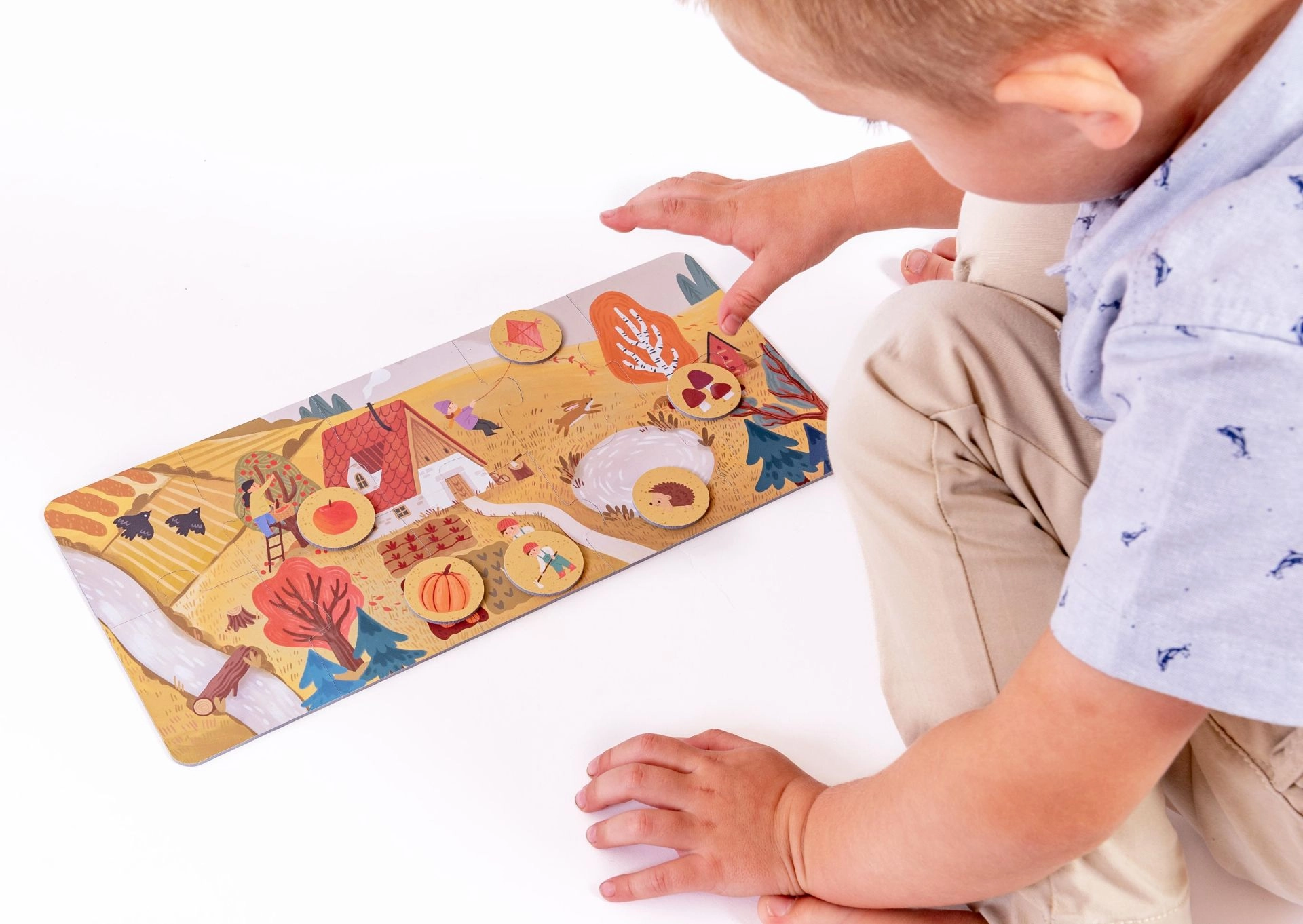 Igra je dizajnirana za male ručice: ekstra veliki dijelovi od 2 mm FSC kartona su izdržljivi, lako se hvataju i potpuno bez plastike. Učenje teče prirodno – djeca vježbaju pažnju, proširuju rječnik i razgovaraju o promjenama u prirodi tijekom godine.