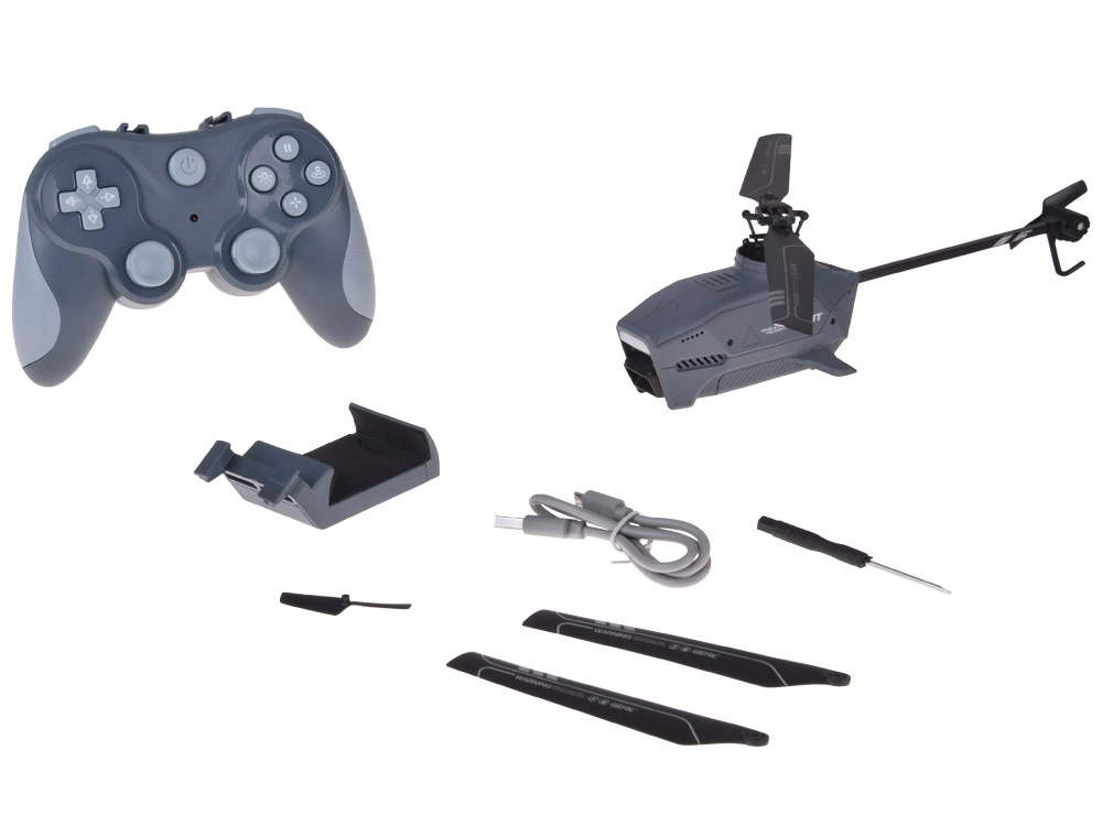 - Helikopter, upravljač, akumulator, USB kabel, rezervne lopatice, stražnji rotor, držač za telefon, odvijač, upute