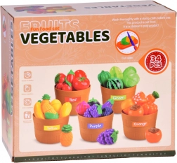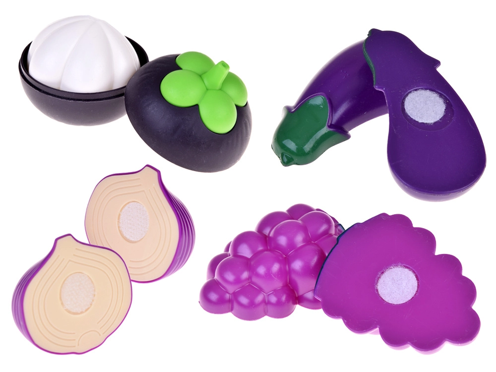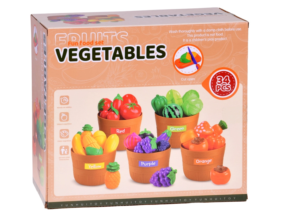 Ovaj veliki set dječje plastične hrane spaja zabavu i učenje. Djeca mogu “rezati” komade na polovice i ponovno ih spajati zahvaljujući čičku, razvrstavati ih po boji u košare te kroz igru učiti nazive voća i povrća. Realistični oblici i jarke boje potiču istraživanje i pretend play u dječjoj kuhinjici.