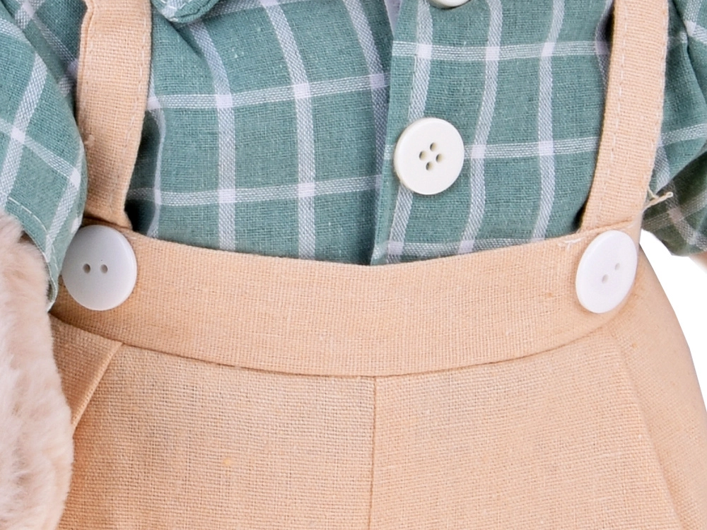 Medo Franek spaja nježnost i bezvremenski dizajn. Njegov baršunasti pliš jednostavno poziva na zagrljaj, a decentne izvezene crte lica stvaraju drag, univerzalan izraz. Stilna zelena košulja s bijelim karom i svijetle kratke hlače s tregerima unose u svaku sobu ugodnu atmosferu.