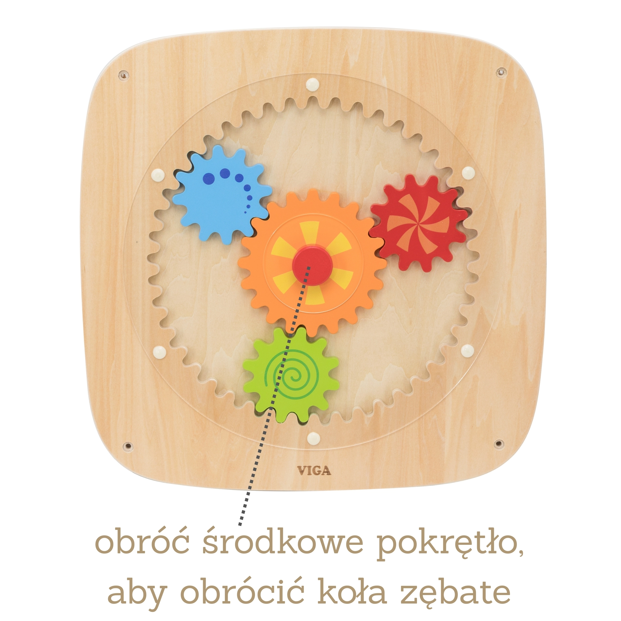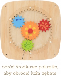 Ova drvena zidna ploča s obojenim zupčanicima osmišljena je da djeci pruži radost otkrivanja. Okretanjem središnjeg kotačića pokreću se svi prijenosi odjednom, što djeci prirodno pokazuje princip sile, kretanja i uzročno-posljedičnih veza. Različite boje i uzorci na kolima pri okretanju stvaraju atraktivne vizualne efekte.