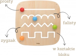 Drvena ploča VIGA pretvara svakodnevnu igru u smisleno iskustvo. Djeca pomiču kuglice po različitim stazama, istražuju prave linije, valove, cik-cak i blokovite oblike, vježbaju hvat, preciznost pokreta i uče pojmove kao što su krivulje i kutovi. Prirodno drvo, zaobljeni rubovi i čvrsto pričvršćenje osiguravaju sigurnost pri svakom dodiru.
