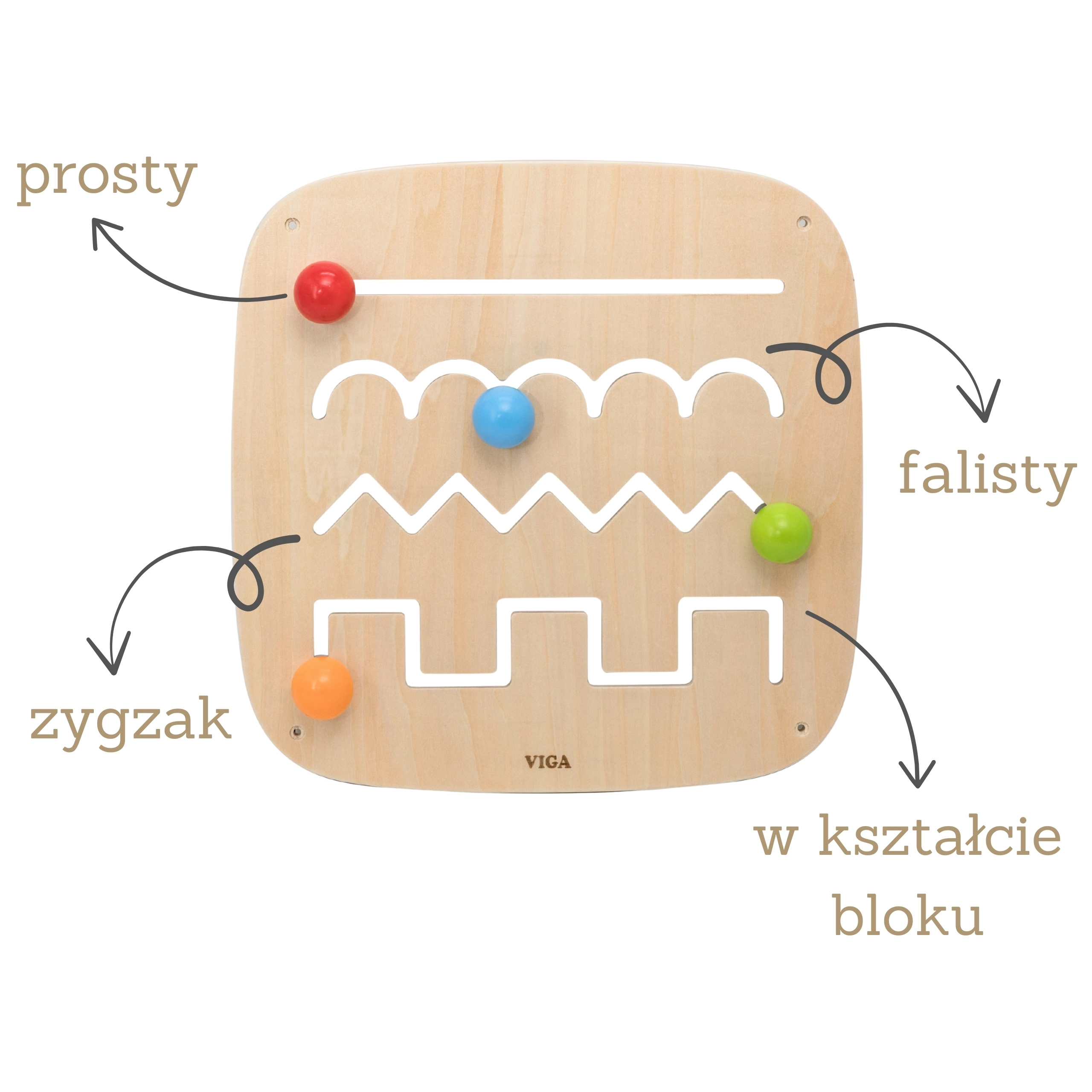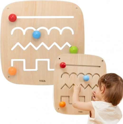 Otkrijte zabavan način učenja s drvenom zidnom pločom VIGA. Potpomaže razvoj fine motorike, koordinacije oko–ruka i prepoznavanja oblika i boja. Četiri urezane staze – ravna, valovita, cik-cak i blokovita – s šarenim kliznim kuglicama sigurno su pričvršćene i idealne za djecu od 12 mjeseci. Jednostavna zidna montaža, čvrsta drvena izrada za sigurnu i izdržljivu igru.