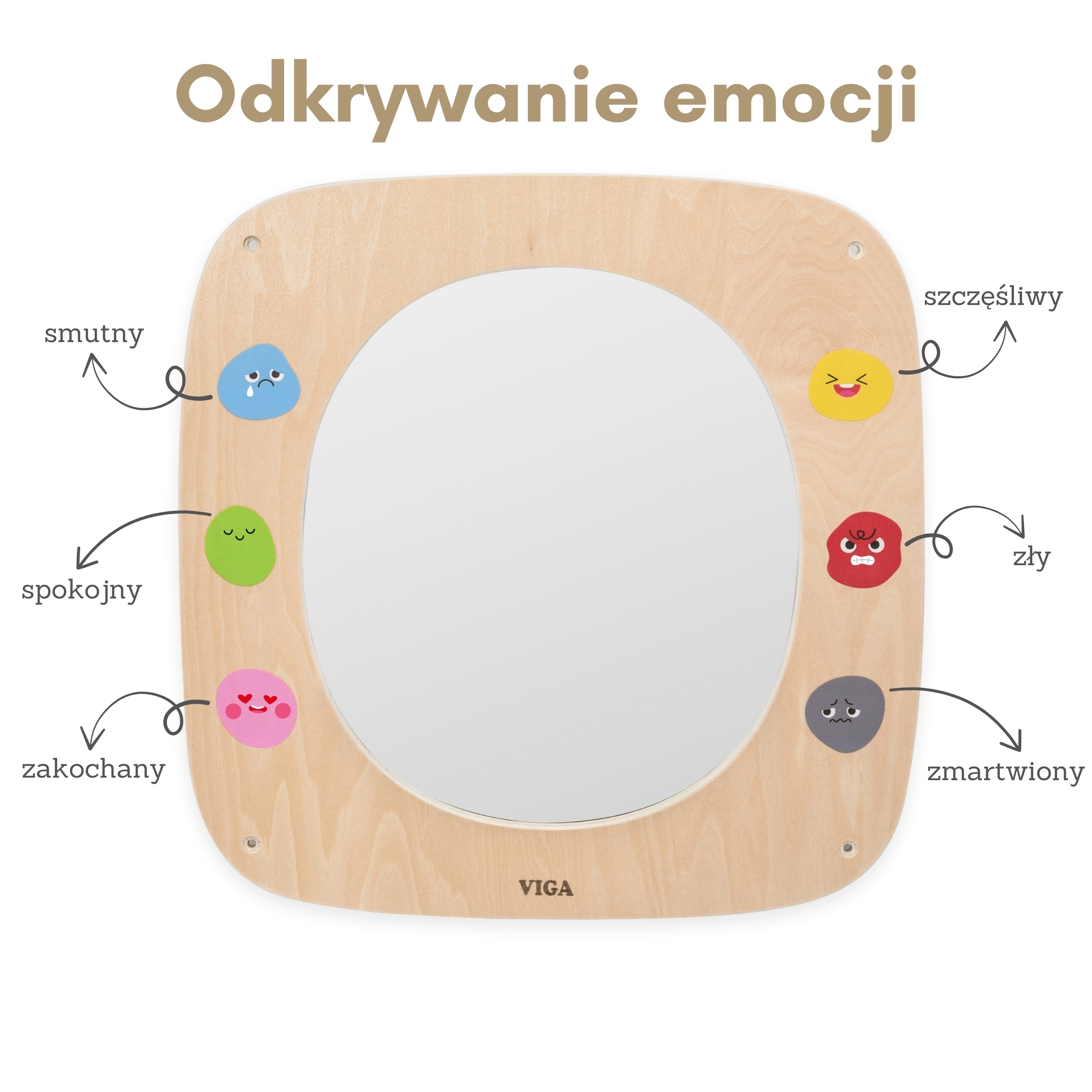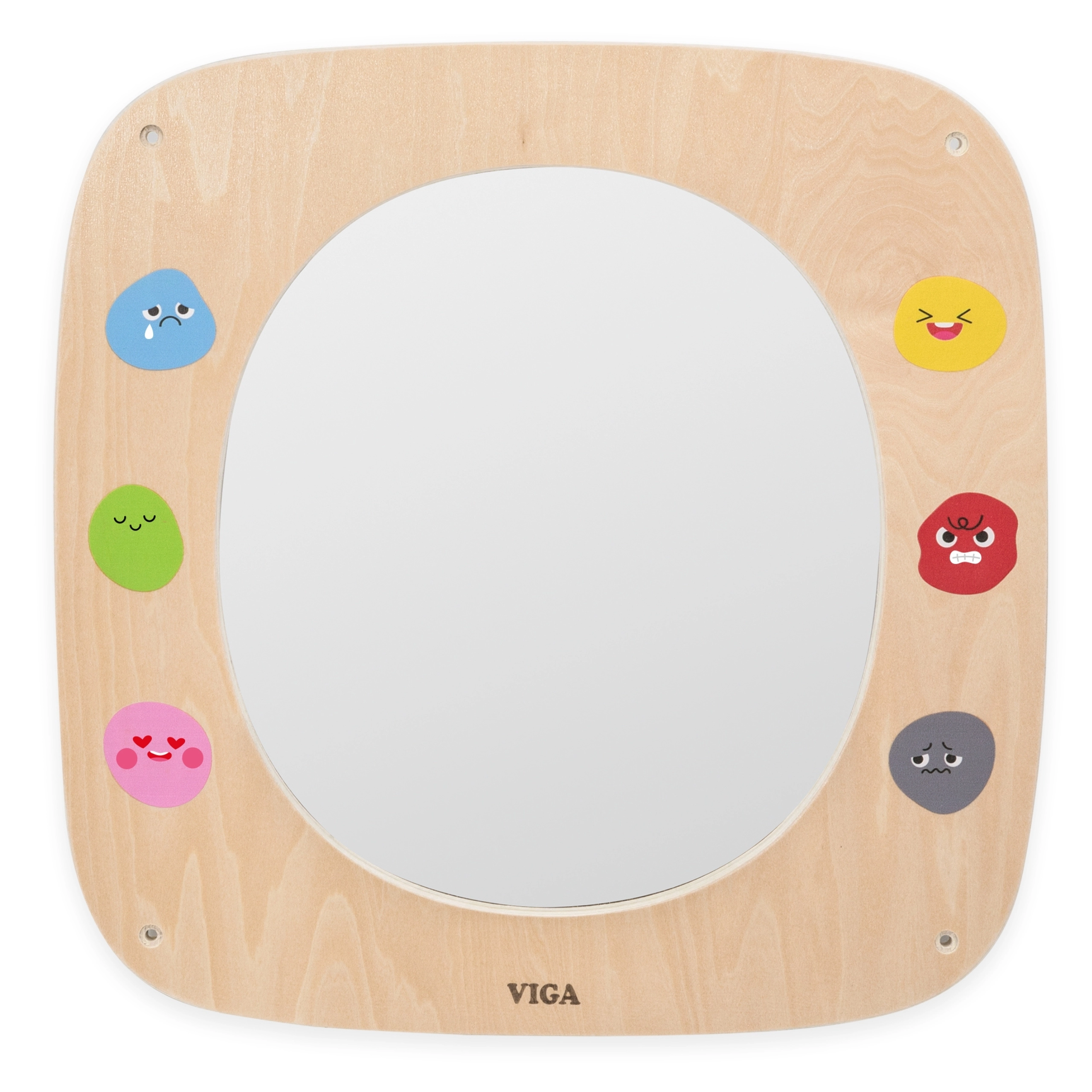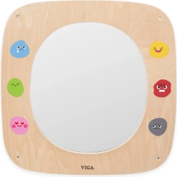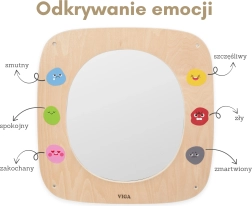 Drvena zrcalna ploča VIGA idealna je za dječju sobu, vrtiće i igraonice. Veliko sigurno zrcalo s preglednim okvirom pomaže djeci upoznavati vlastite izraze, oponašati mimiku i učiti razlikovati emocije. Šareni emotikoni oko okvira potiču razgovor o osjećajima i prirodno razvijaju emocionalnu inteligenciju.