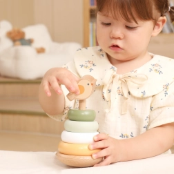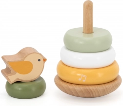 Drveni slagajući toranj s preslatkim ptićem na vrhu razveselit će svako dijete. Šareni prstenovi s glatkim rubovima lako se hvataju i slažu u različitim redoslijedima, što potiče razlikovanje boja i veličina te rješavanje problema. Stabilna baza i ugodno zaobljeni oblici osiguravaju sigurnu manipulaciju za male ruke.