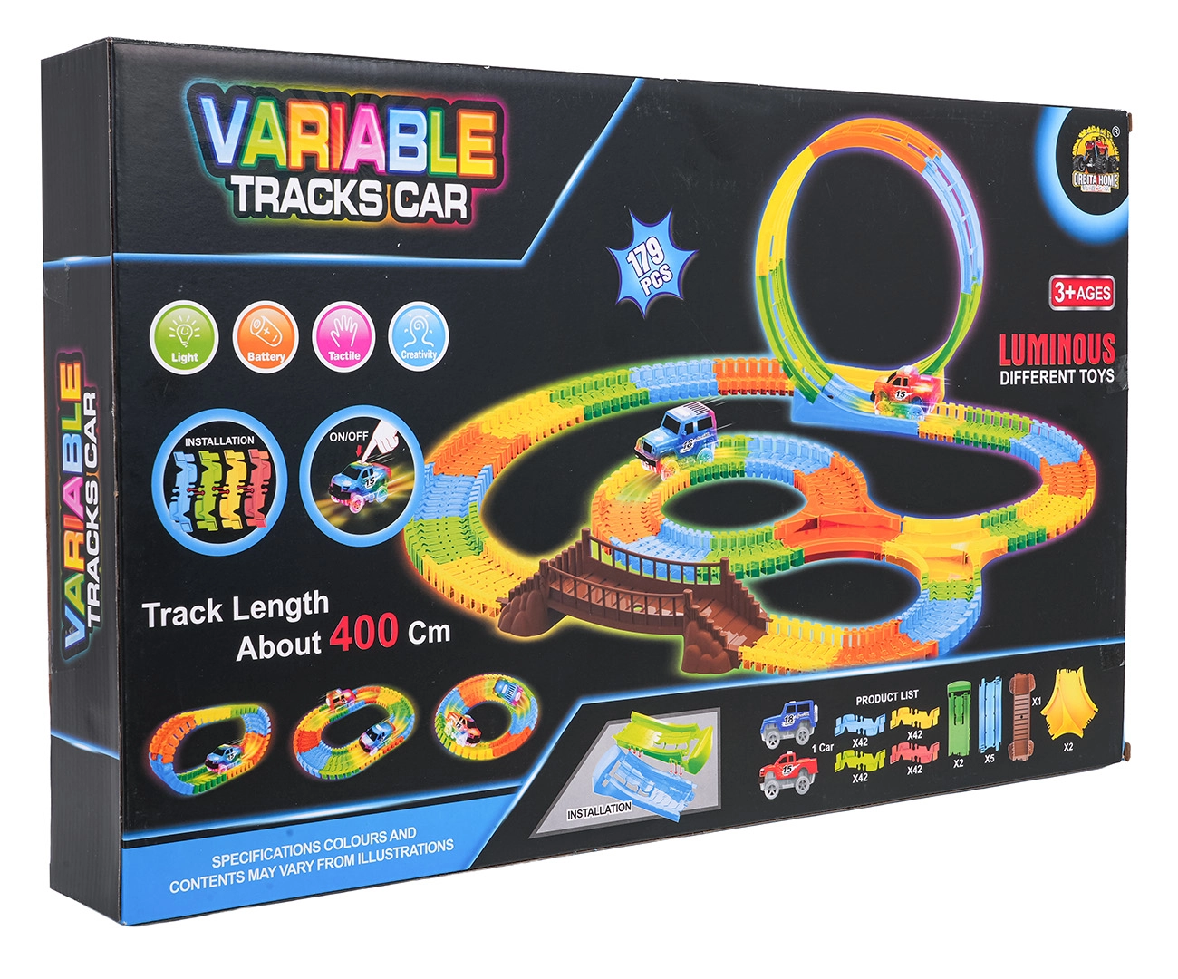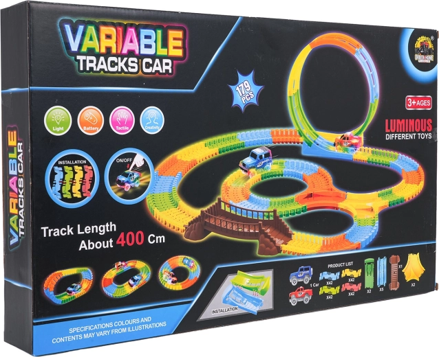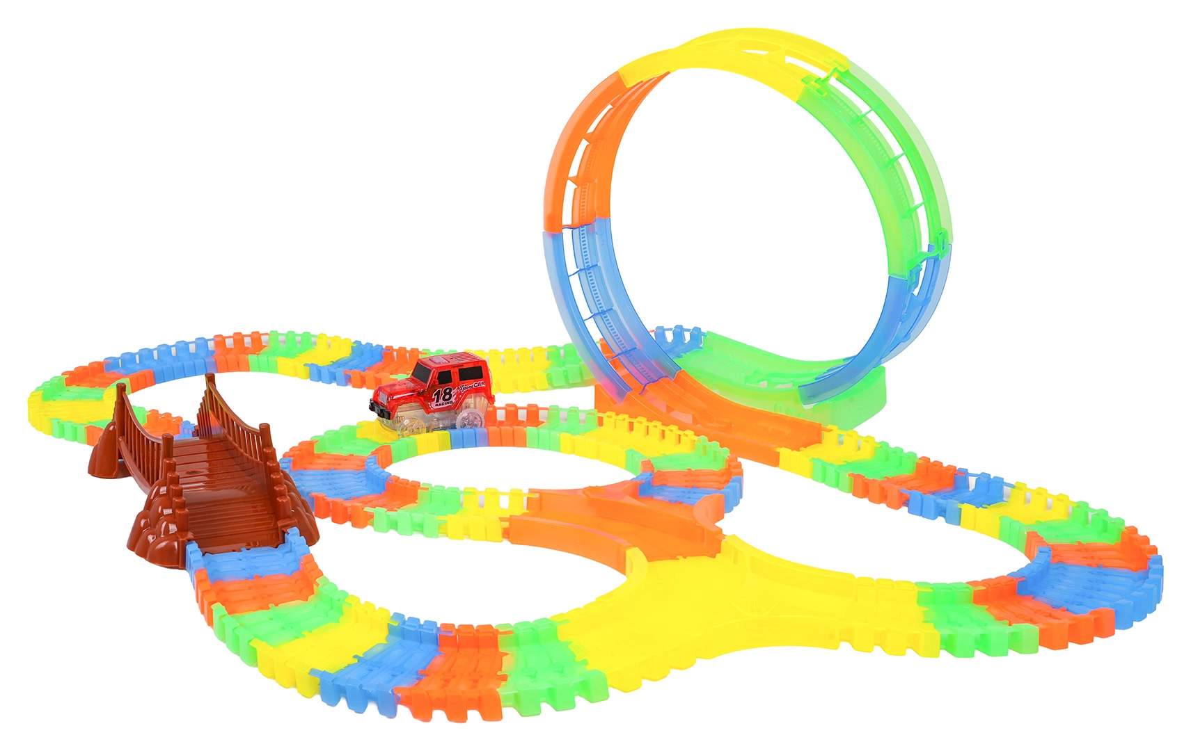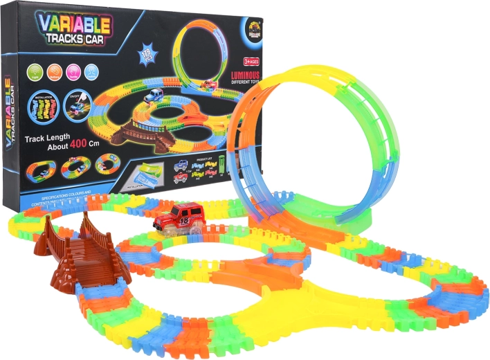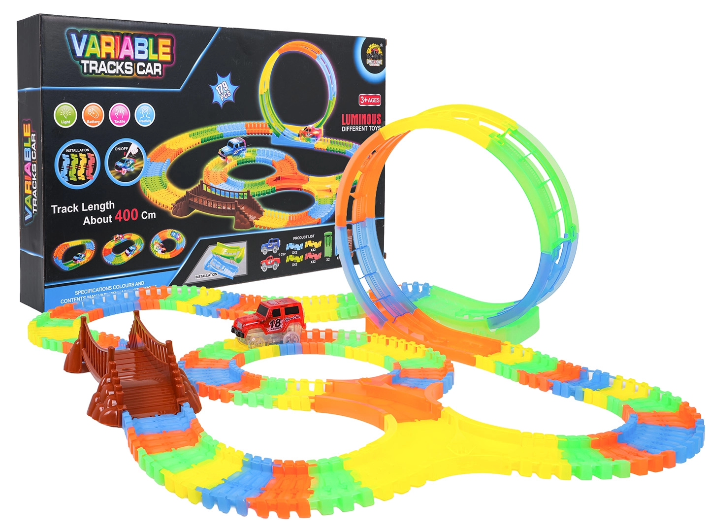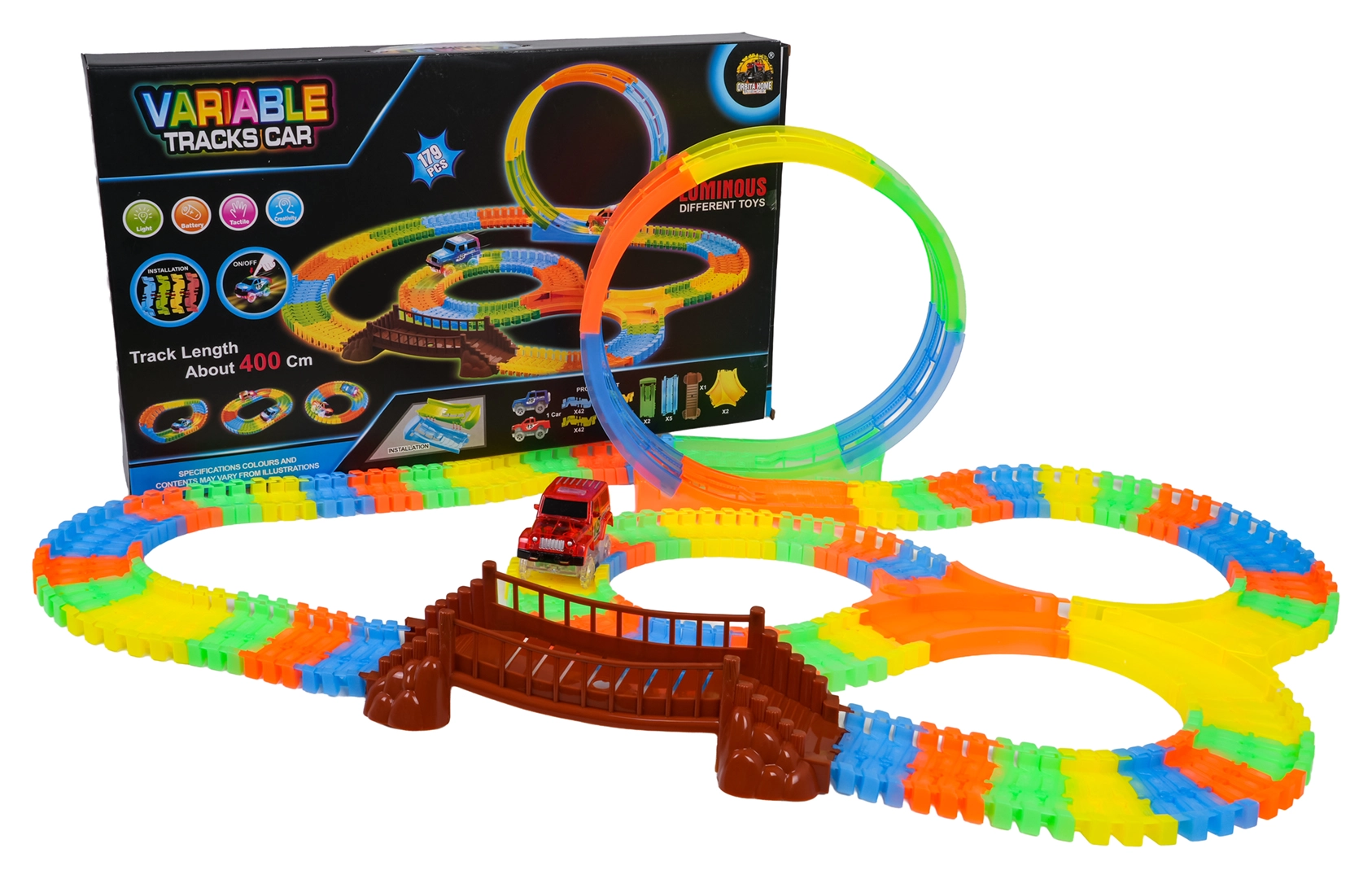 Ova šarena autodruma razveselit će djecu već od 3 godine. Zahvaljujući fleksibilnim segmentima složit ćete ravnice, zavoje, most pa i veliku okomitu petlju – i to u trenu. Fluorescentna izvedba osigurava efekt sjaja u mraku, dok LED autić juri stazom i ostavlja svjetlosni trag.