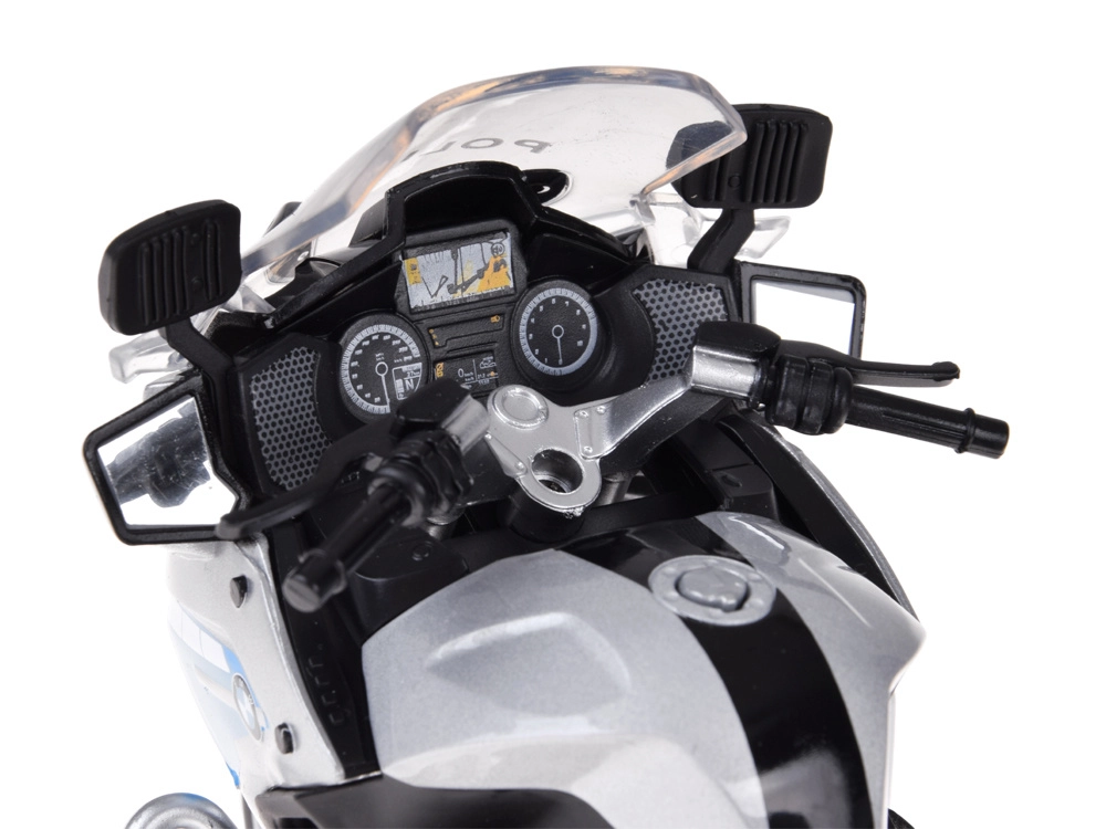 Upravljač, zrcala, prozirni štit i vjerno otisnuti instrumenti naglašavaju autentičan izgled policijskog motocikla.