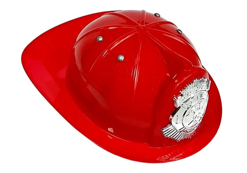 Crvena dječja kaciga s ventilacijskim nitnama i amblemom pruža udobno nošenje i odlično upotpunjuje vatrogasni kostim.