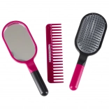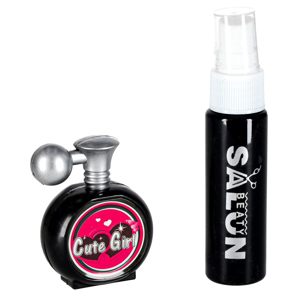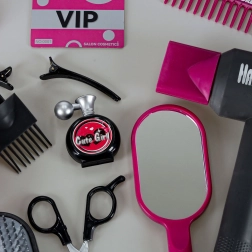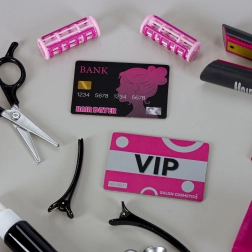 Zrcalce, četka, češalj, sigurnosne škare i efilačne škare, vikleri s kopčama, bočice za „kozmetiku” i platne kartice za igru salona.