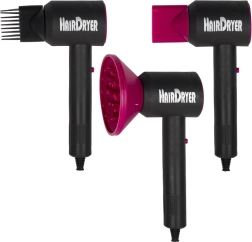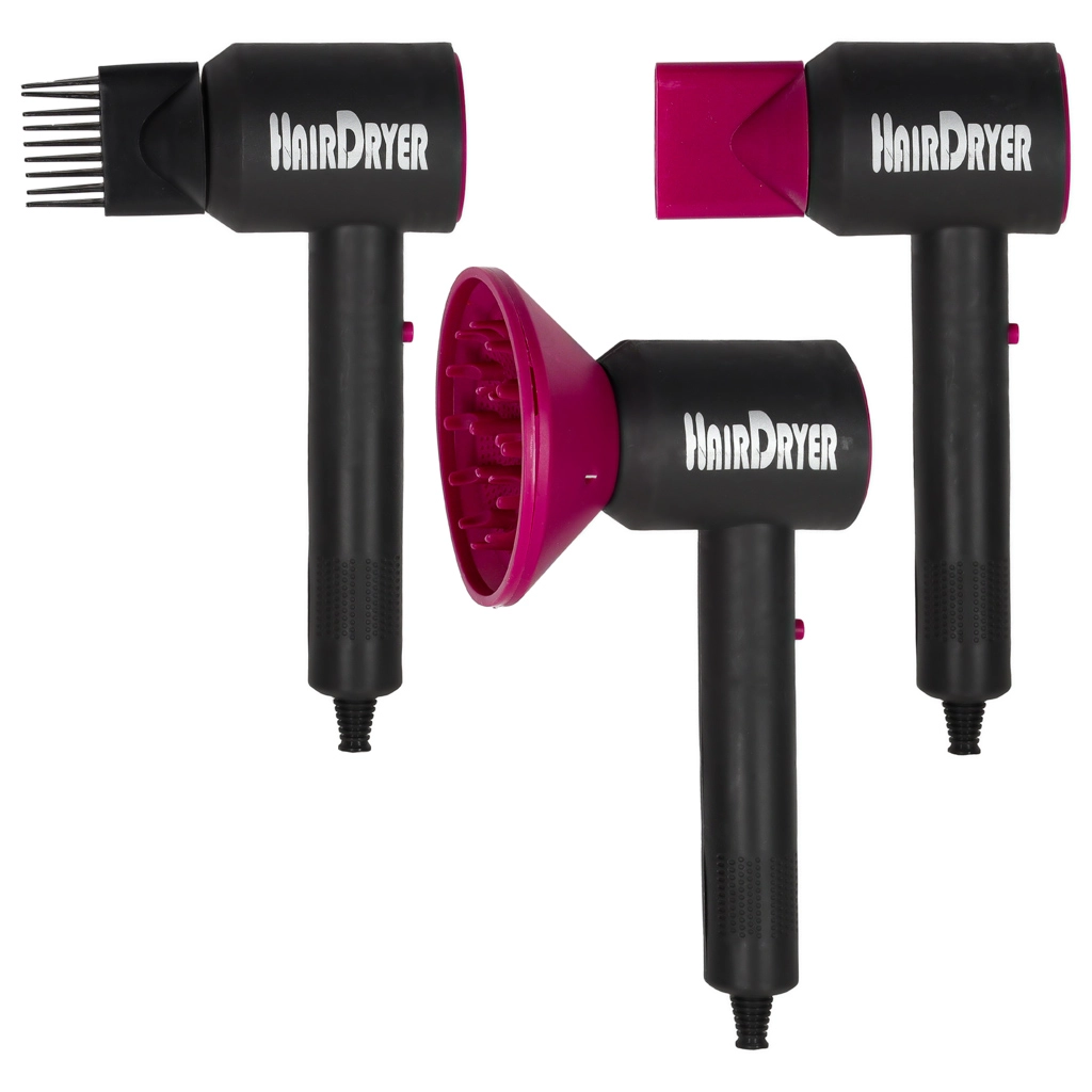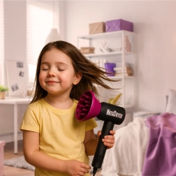 Kompaktno dječje sušilo sa zvučnim efektom i izmjenjivim nastavcima – koncentrator, difuzor i nastavak s češljem – za usmjeravanje strujanja zraka te stvaranje volumena i valova.