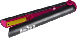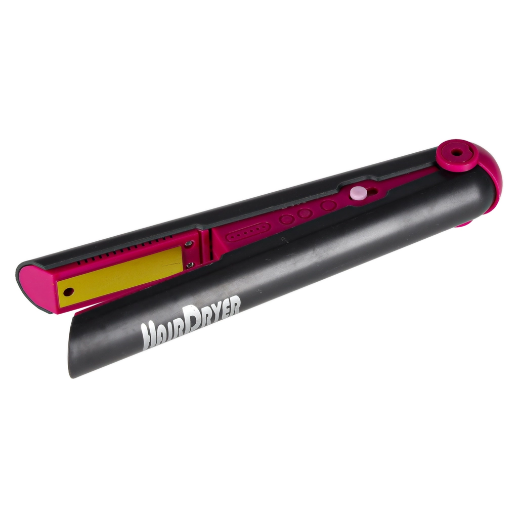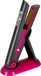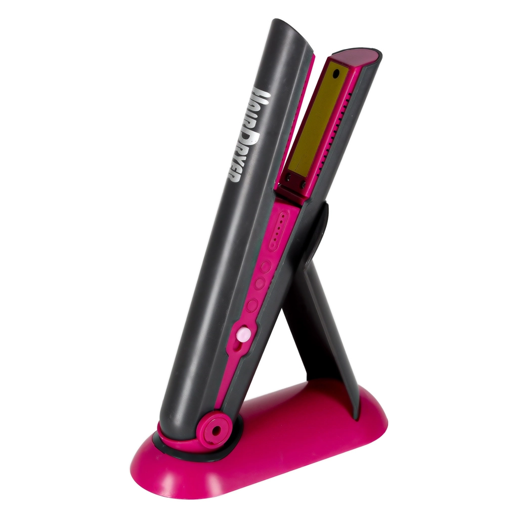 Dječja pegla za kosu svijetli na pritisak i oponaša rad, bez zagrijavanja. U paketu je praktičan dvočlani stalak za sigurno odlaganje.