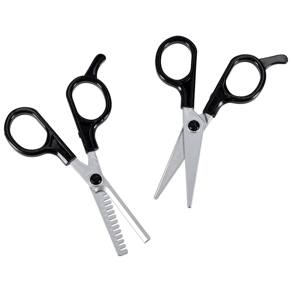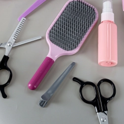 Četka, češalj, škare bez oštrica, efilačne škare, vikleri, šnalice i prazna bočica – kompletna oprema za svakodnevne frizerske priče.
